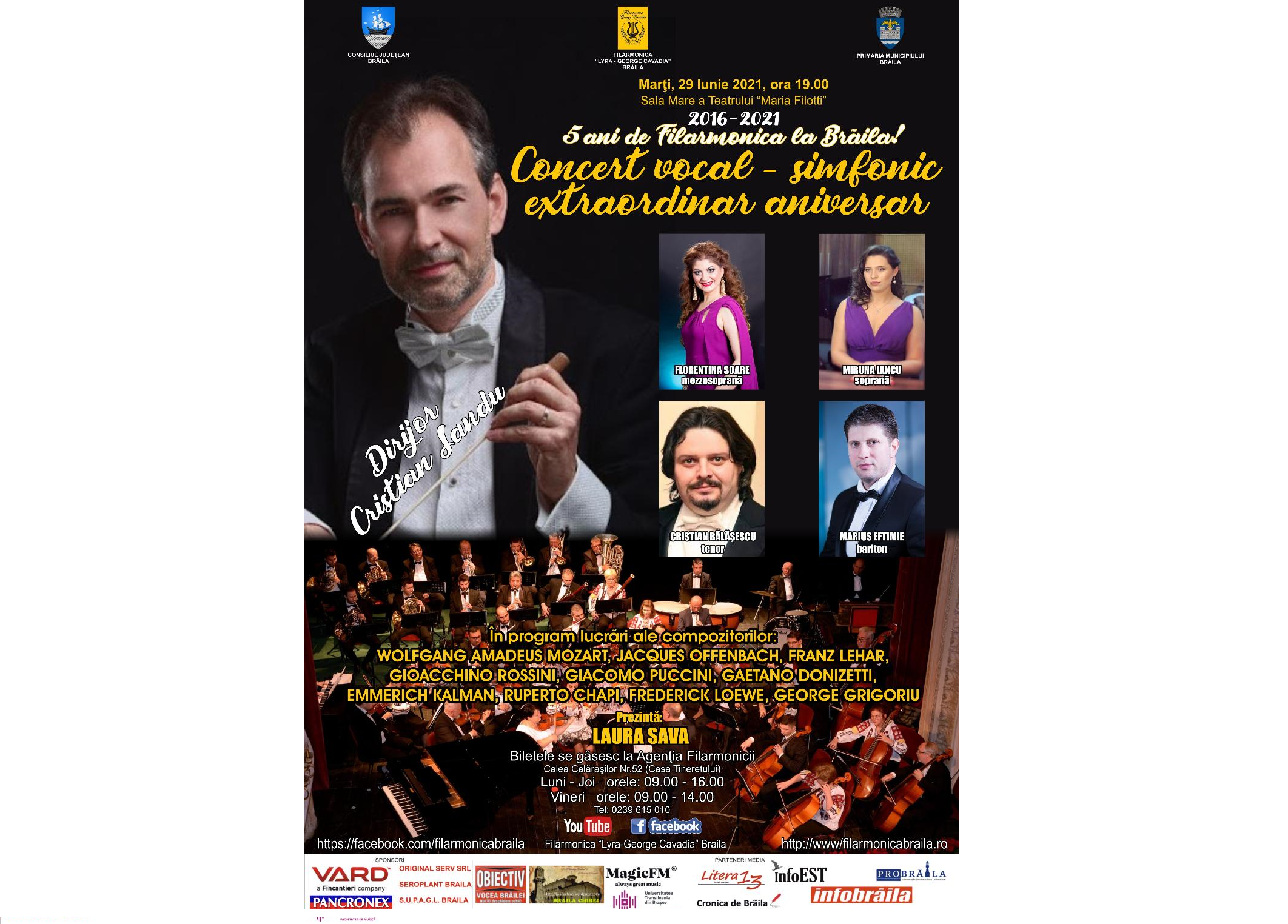 Un regal de opera şi operetă, dedicat împlinirii a 5 ani de la înfiinţarea Filarmonicii “Lyra – George Cavadia” Brăila şi sărbătoririi Zilei Internaţionale a Dunării. Concertul vocal-simfonic aniversar extraordinar, la care Filarmonica “Lyra – George Cavadia”, filarmonica ce se afla sub autoritatea Consiliului Judeţean Brăila, vă invită să luaţi parte, se înscrie pe linia concertelor unde talentul, profesionalismul şi vocaţia muzicienilor produce frumuseţe, bucurie, fericire, linişte, lumină şi multă ordine, în minţile, sufletele şi vieţile oamenilor, mai necesare ca oricând.