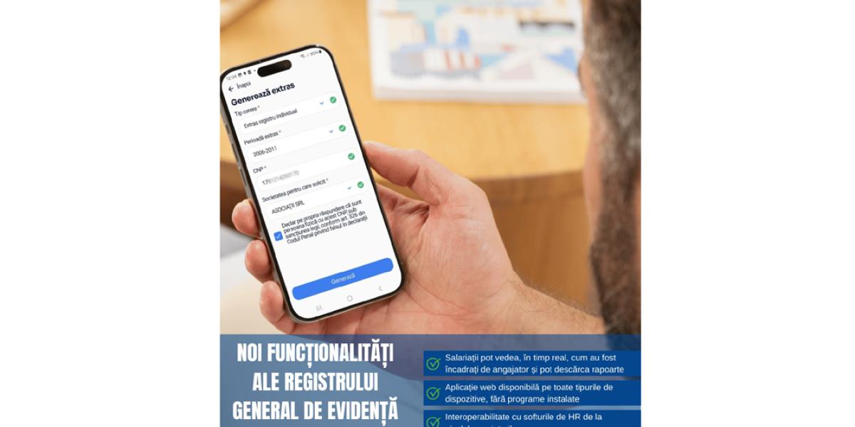 - Acces direct pentru salariați la datele proprii, inclusiv posibilitatea de verificare în timp real a înregistrării corecte a elementelor contractului individual de muncă, cum ar fi durata timpului de muncă și salariul, și descărcarea unui extras pentru dovedirea vechimii în muncă;