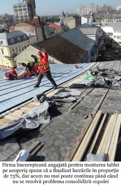 Conducerea firmei care a câştigat licitaţia organizată în vara anului trecut, pentru învelirea acoperişului teatrului, "Acopero Serv" SRL Bucureşti, ne-a declarat, în urmă cu câteva zile, că a finalizat lucrarea în proporţie de 75%, însă a trebuit să se oprească. "Am primit un ordin de încetare a lucrărilor, de la Primărie. Nu mai putem înainta până când nu este consolidată cupola acoperişului. Nu ştim exact cât va dura această operaţiune, probabil patru săptămâni", ne-a declarat Ionuţ Gogeneaţă, directorul tehnic al "Acopero Serv".