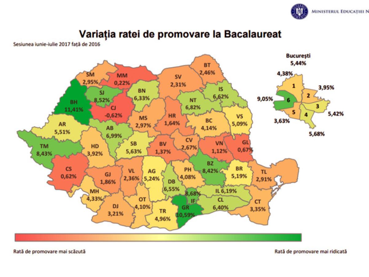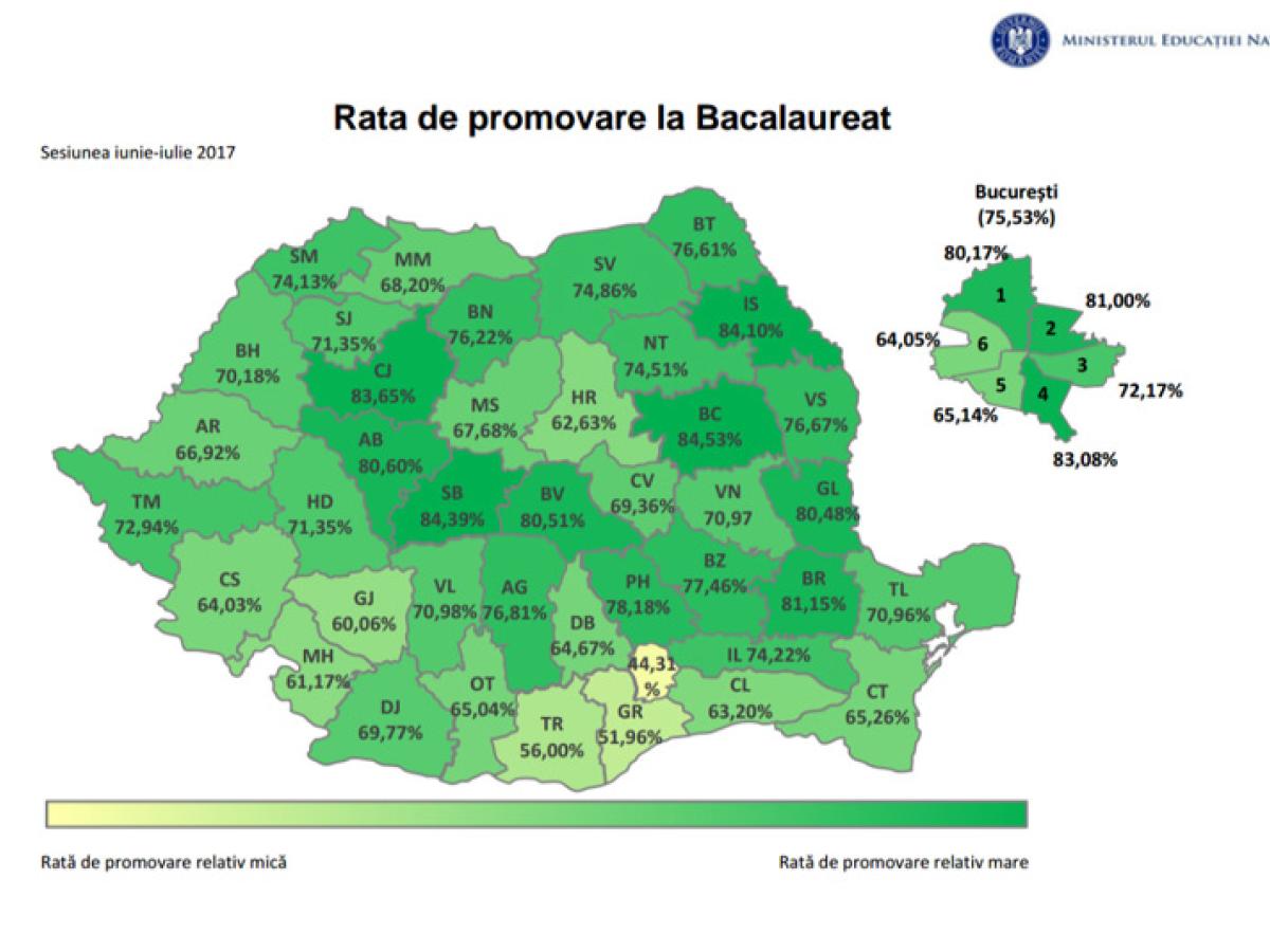 Potrivit Ministerului Educaţiei, cele mai ridicate procente de promovare (peste 83%) s-au înregistrat în judeţele Bacău (84,53% comparativ cu 83,54% înainte de contestaţii), Sibiu (84,39% comparativ cu 83,73%), Iaşi (84,10% comparativ cu 82,91%) şi Cluj (83,65% comparativ cu 82,75%). Rata finală de promovare în Capitală este de 75,83% (în creştere de la 74,09%). Judeţele în care rata de promovare a rămas sub 55% sunt Ilfov (44,31%) şi Giurgiu (51,96%).