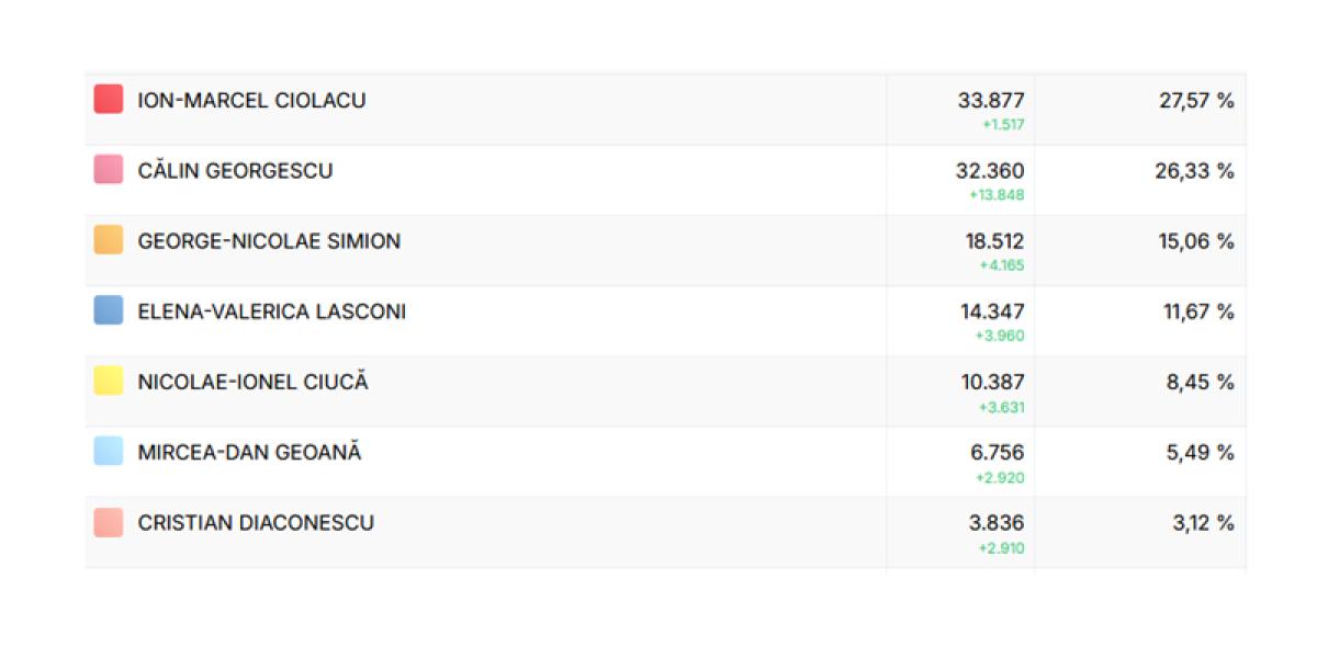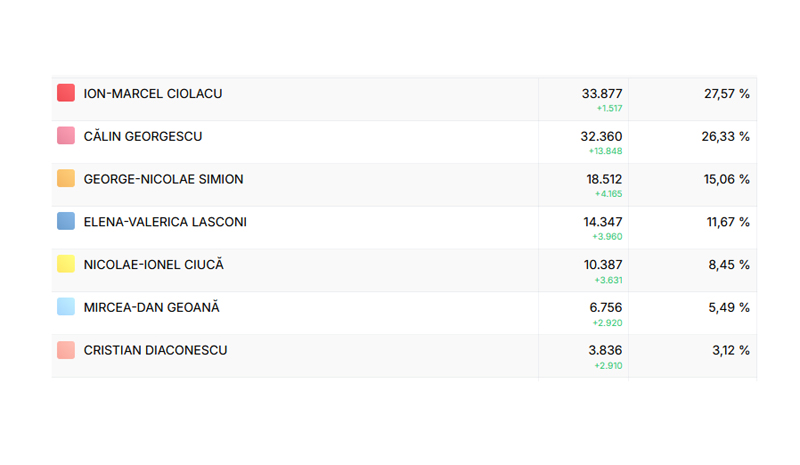 • potrivit datelor postate pe roaep.ro, candidatul PSD, premierul Marcel Ciolacu, a obținut un procent de 27,57% din voturi în județul Brăila, urmat pe locul 2 de candidatul independent Călin Georgescu, 26,34% • pe locul 3 se află George Simion, liderul AUR cu 15,07%, urmat pe locul 4 de Elena Lasconi cu 11.68% și pe 5 de Nicolae Ciucă cu 8.45%