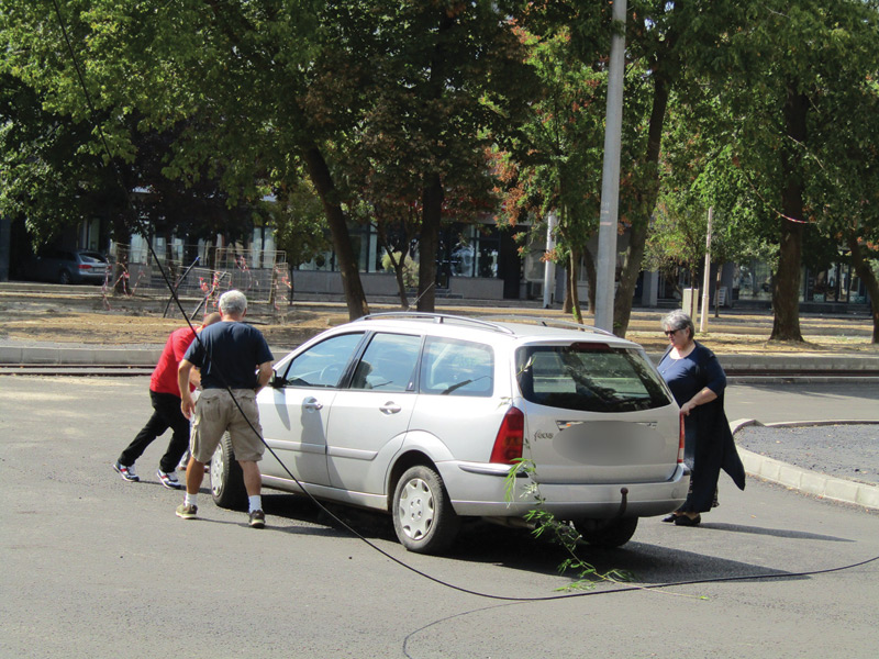 iar o sumedenie de cabluri atârnau ori erau culcate la pământ. Probabil neatent ori ocolind un cablu, șoferul autoturismului a ajuns cu acesta pe canalizarea în cauză, mult mai înaltă decât garda de la sol a mașinii. Zgomotul puternic și impactul produs au dat impresia că baia de ulei sau cutia de viteze au fost distruse. Spre norocul proprietarului autoturismului, nu s-a întâmplat așa, iar alt noroc a fost că incidentul s-a petrecut la o oră a după-amiezii când de regulă pe stradă circulația este redusă, iar doi tineri brăileni au sărit în ajutorul șoferului, pentru a “coborî” de pe soclul canalizării mașina care a putut astfel să circule mai deparate, după un nedorit test de anduranță.