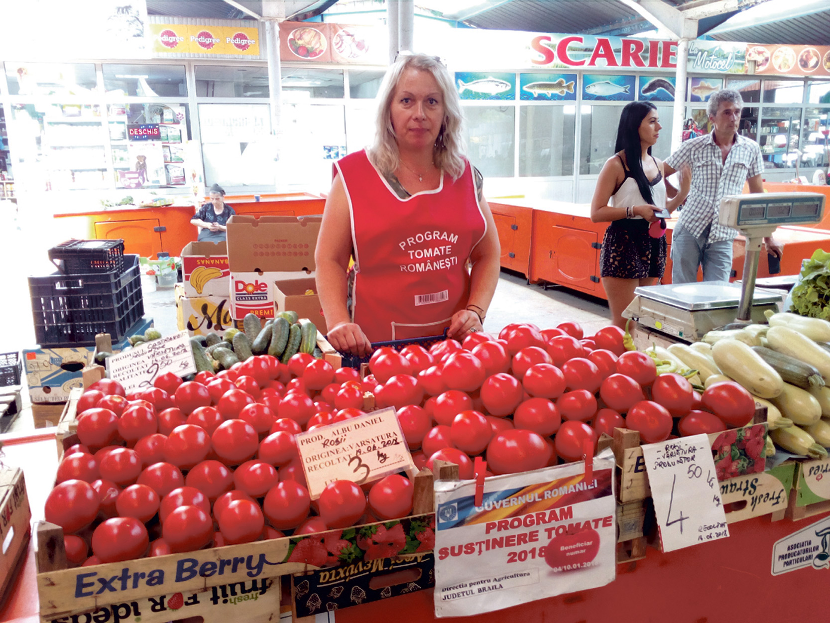 Familia Albu are tarabă în Piaţa Concordia şi-o găsiţi cu produse cultivate în sera proprie în fiecare zi până la ora 14.00, atunci când pleacă să culeagă marfa pentru a doua zi. De 20 de ani practică această îndeletnicire şi şi-au făcut un renume acolo în piaţă, la care ţin foarte mult şi de aceea nu fac rabat la calitate când vine vorba de produsele pe care le aduc la vânzare, începând cu roşii, dar şi castraveţi, ardei gras, dovlecei ori vinete. “Avem o experienţă de 20 de ani în domeniu. Oamenii care-şi fac în mod regulat piaţa aici ne cunosc, ne cunosc produsele şi ne caută. Suprafaţa serelor pe care le îngrijim este mult mai mare decât limita considerată eligibilă în acest program naţional. Este al doilea an în care ne-am înscris în acest program naţional pentru că sprijinul financiar este un ajutor în plus pentru noi. Este o garanţie că încasăm nişte bani. Noi oricum suntem pe piaţă cu produsele noastre şi ne valorificăm marfa. Avem şi soiuri româneşti, de Buzău, dar sunt pentru ciclul II de producţie, pentru că ne-ar fi fost mult mai greu în ciclul I cu soiurile de Buzău care sunt pretenţioase. Anul acesta vremea ne-a ajutat şi avem marfă bună şi multă. Partea proastă este că piaţa este inundată de roşii, iar asta se vede în preţ. Dacă în alţi ani, la vremea asta preţul era undeva la 5 lei per kilogram, acum suntem la 3,5 lei. Dar, repet, înscrierea în acest program este o garanţie a unor bani. Dar de acum şi până în decembrie noi avem la vânzare produse pe care clienţii le apreciază şi le caută. Produsele noastre nu sunt coapte forţat, cum se zice. În al doilea rând este gustul care-i determină pe clienţi să revină la noi să cumpere. Dacă omul a ajuns cu roşia acasă şi când a mâncat-o n-a avut nici un gust, altădată nu mai vine, şi ne face reclamă negativă între vecini. Nu ne permitem aşa ceva pentru că este munca noastră”, ne-a declarat Daniel Albu.