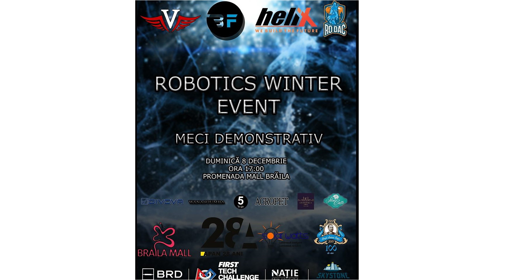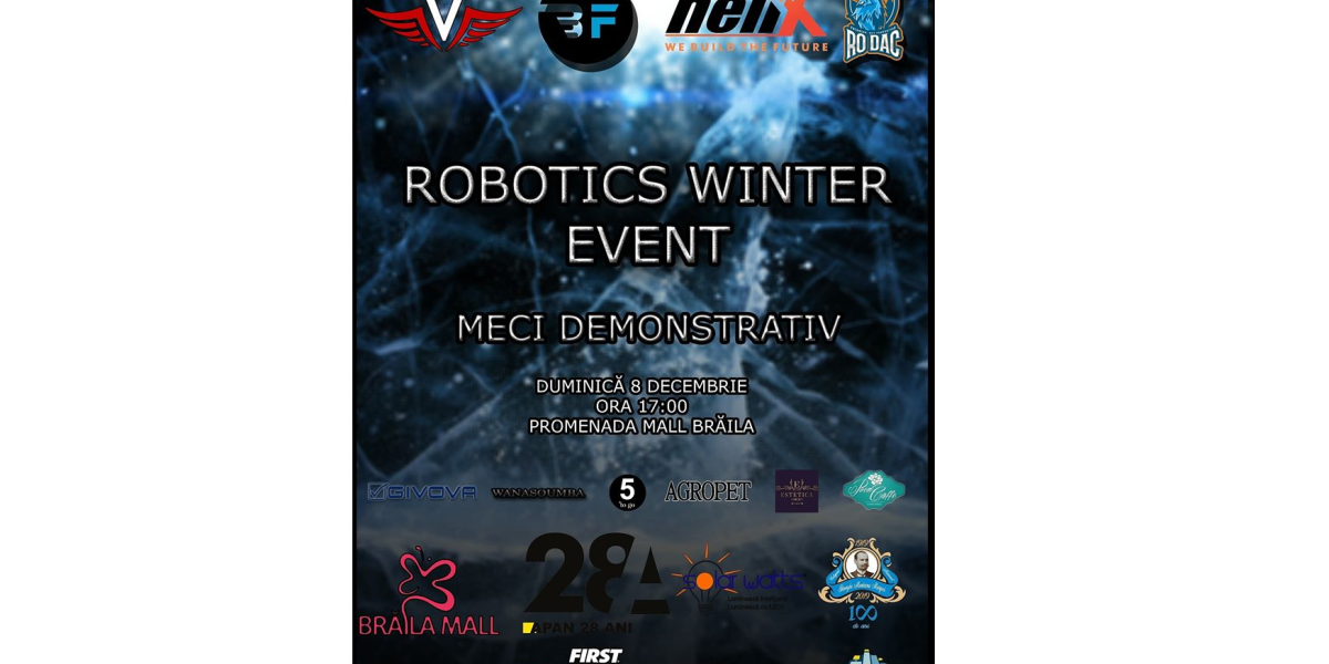 Weekendul acesta, roboţii “iau cu asalt” Brăila Mall. Duminică, 8 decembrie, începând cu ora 17:00, va avea loc competiţia amicală “Robotics Winter Event”, unde brăilenii vor avea ocazia să vadă în acţiune patru echipe de robotică din Brăila şi Galaţi, toate calificate la BRD First Tech Challenge, cea mai puternică competiţie de robotică. “Velocity”, “Helix”, “Rodac” şi “Byteforce" sunt echipele care îşi vor prezenta “arsenalul”, scopul evenimentului fiind acela de a promova robotica şi dezvoltarea elevilor prin intermediul activităţilor educaţionale de tip STEM ( Ştiinţă, Tehnologie, Inginerie, Matematică).
