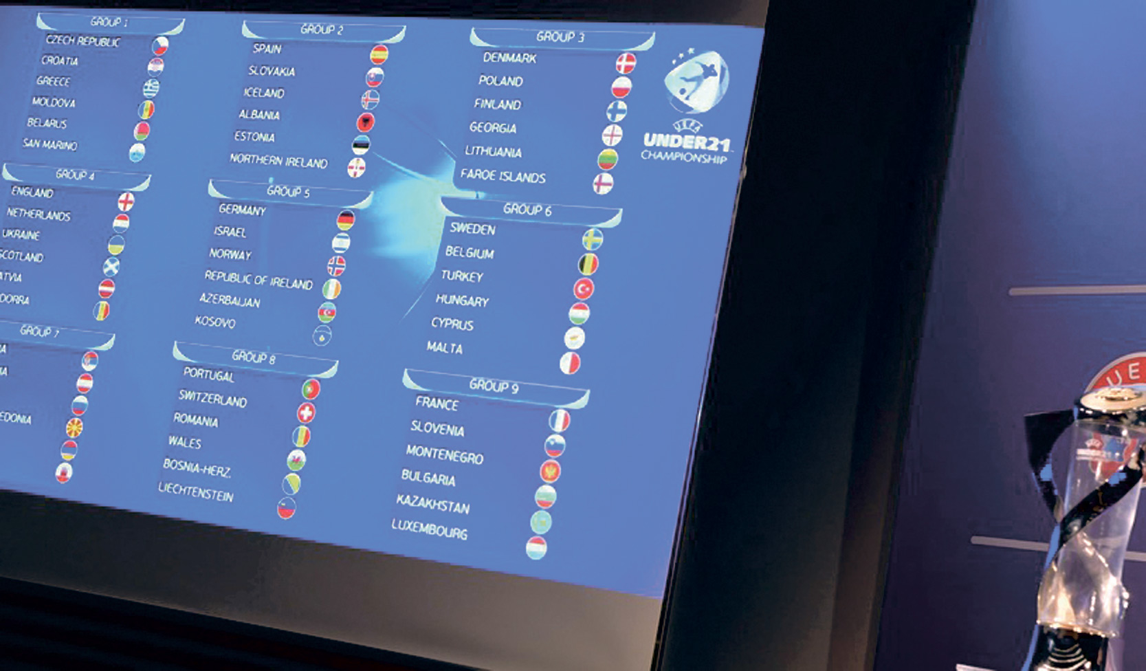 Naţionala U21 a României va juca în grupa a opta, alături de Portugalia, Elveţia, Ţara Galilor, Bosnia Herţegovina şi Liechtenstein, în preliminariile Campionatului European de fotbal care va avea loc în 2019 în Italia, conform tragerii la sorţi care a avut loc ieri la Nyon. Preliminariile sunt programate să înceapă în martie 2017 şi se vor încheia în noiembrie 2018.