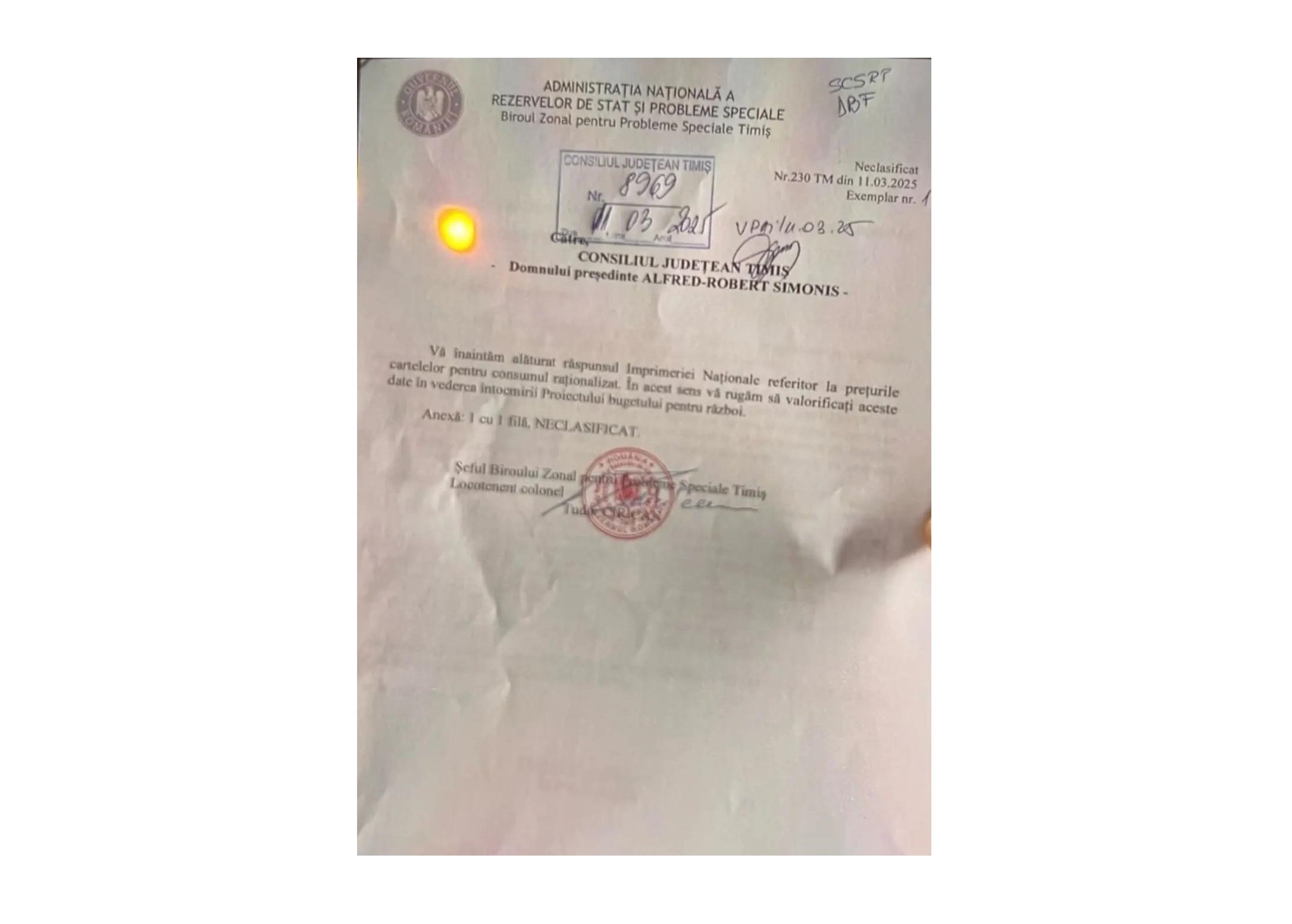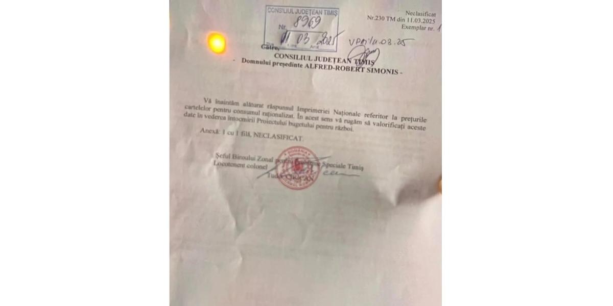 Un document îngrijorător a circulat zilele trecute pe rețelele de socializare, băgând spaima în populație, zăpăcită și așa de ”îngrijorările” UE, cu privire la o așa-zisă posibilă invazie a Rusiei peste țările europene. Despre asta se discută acum în cancelariile europene : bani mai mulți pentru înarmare, sprijinirea în continuare a Ucrainei cu bani, cu trupe de menținere a păcii, în condițiile în care SUA nu mai vrea război etc etc. Fix pe aceeași linie și-a făcut apariția un document neclasificat, adresat președintelui CJ Timiș din partea Administrației Rezervelor de stat și Probleme Speciale: ”Vă înaintăm alăturat răspunsul Imprimeriei Naționale cu privire la prețul cartelelor pentru consumul raționalizat. În acest sens vă rugăm să valorificați aceste date pentru întocmirea Proiectului Bugetului pentru război”.
