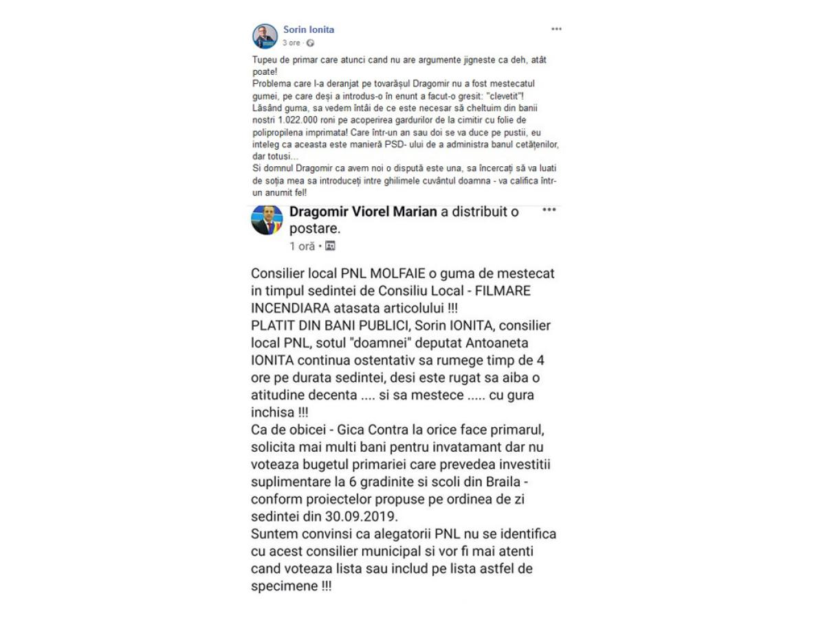 Chiar şi după ce şedinţa s-a încheiat, “războiul” pe tema gumelor de mestecat s-a mutat în mediul virtual, unde atât primarul Marian Dragomir, cât şi consilierul liberal Sorin Ioniţă au venit cu acuze unul asupra altuia.