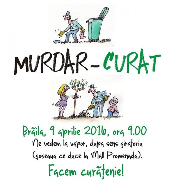 Campania de ecologizare "Murdar - Curat", iniţiată de caricaturistul Costel Pătrăşcan, continuă. Sâmbătă, 9 aprilie, la ora 9.00, brăilenii sunt aşteptaţi la vaporul amplasat la intersecţia Şoselei de Centură cu Drumul Mării (DE 584), şoseaua ce duce spre Brăila Mall.