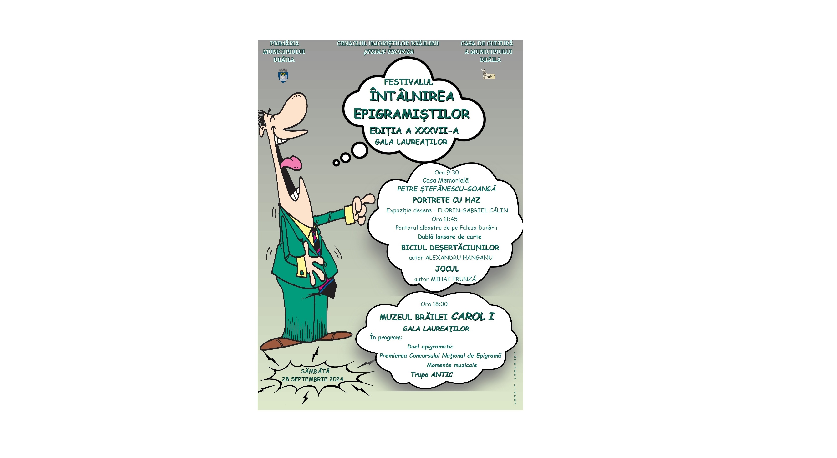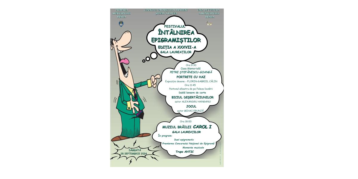 Cei mai buni epigramişti şi oameni de umor din România și din Republica Moldova vor veni, în acest week-end, la Brăila, pentru a participa, astăzi, sâmbătă, 28 septembrie, începând cu ora 18:00, în Sala „Regele Ferdinand I și Regina Maria” a Muzeului Brăilei „Carol I”, la Gala Laureaților celei de-a XXXVII-a ediție a Festivalului Concurs „Întâlnirea epigramiştilor”, manifestare organizată de Casa de Cultură a Municipiului Brăila și Clubul Umoriştilor Brăileni (CUB) „Ştefan Tropcea”, în colaborare cu Primăria Municipiului Brăila.