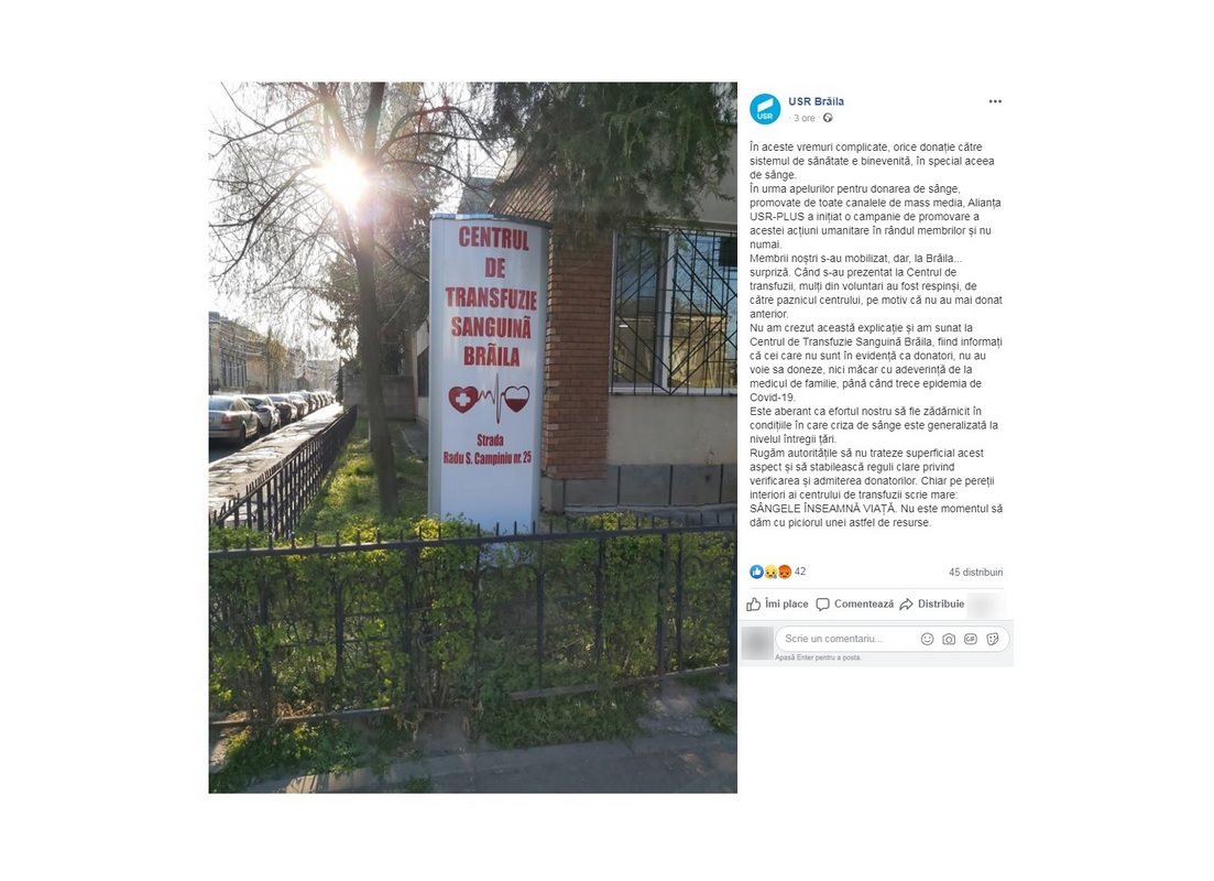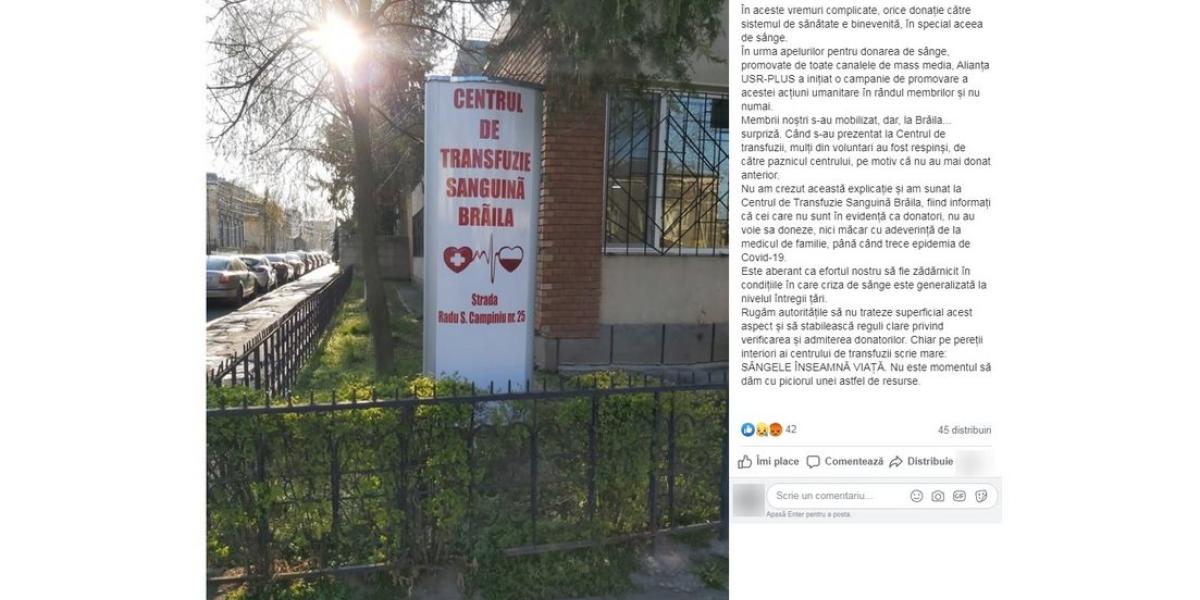 ”În aceste vremuri complicate, orice donație către sistemul de sănătate e binevenită, în special aceea de sânge. În urma apelurilor pentru donarea de sânge, promovate de toate canalele de mass media, Alianța USR-PLUS a inițiat o campanie de promovare a acestei acțiuni umanitare în rândul membrilor și nu numai. Membrii noștri s-au mobilizat, dar, la Brăila... surpriză. Când s-au prezentat la Centrul de transfuzii, mulți din voluntari au fost respinși, de către paznicul centrului, pe motiv că nu au mai donat anterior. Nu am crezut această explicație și am sunat la Centrul de Transfuzie Sanguină Brăila, fiind informați că cei care nu sunt în evidență ca donatori, nu au voie sa doneze, nici măcar cu adeverință de la medicul de familie, până când trece epidemia de Covid-19. Este aberant ca efortul nostru să fie zădărnicit în condițiile în care criza de sânge este generalizată la nivelul întregii țări. Rugăm autoritățile să nu trateze superficial acest aspect și să stabilească reguli clare privind verificarea și admiterea donatorilor. Chiar pe pereții interiori ai centrului de transfuzii scrie mare: SÂNGELE ÎNSEAMNĂ VIAȚĂ. Nu este momentul să dăm cu piciorul unei astfel de resurse”, se arată în mesajul postat pe Facebook.