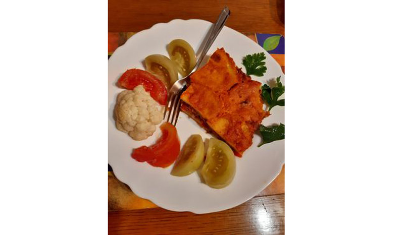 Mod de preparare: Cartofii se spală bine, se fierb, după care se lasă să se răcească, se decojesc şi se taie în felii de ½ cm. Legumele, ceapa, morcovul, ardeiul şi ciupercile se pun pe rând într-un blender, se mixează, se pun într-un vas pe aragaz şi se fierb la foc mic, până scade apa din ele. Se ia compoziţia de pe foc, se adaugă o jumătate din sucul de roşii, sarea, piperul, pătrunjelul. Într-o tavă sau vas de yena, uns în prealabil cu o lingură de ulei de măsline, se pune un strat de cartofi, compoziţia de legume, un alt strat de cartofi, iar deasupra se pune cealaltă jumătate din sucul de roşii amestecat cu un praf de boia de ardei şi un praf de oregano. Se dă la cuptor la 200 grade aproximativ 20-30 minute. La servire se pune deasupra o linguriţă de ulei de măsline. Se combină foarte bine cu o salată de varză sau murături. O puteţi lua la serviciu într-o caserolă, deoarece merge servită şi rece.