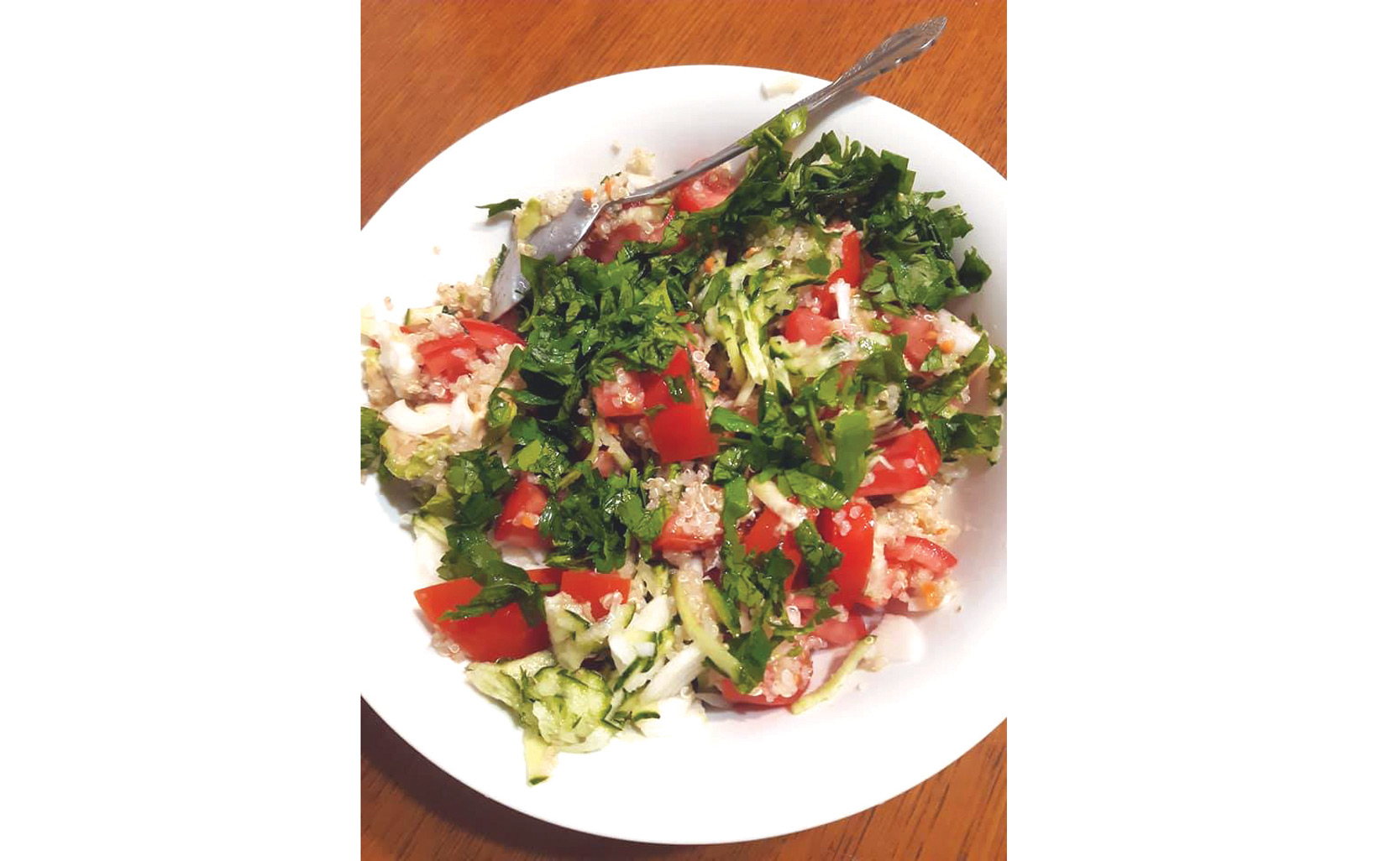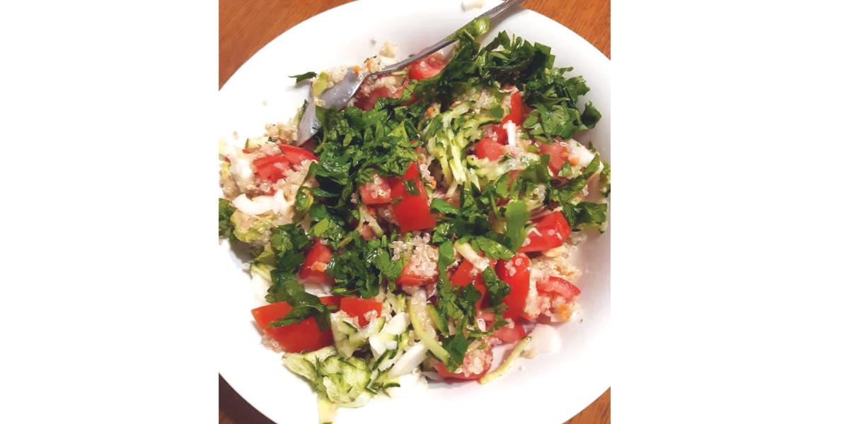 Salată de legume cu quinoa - o roşie, un castravete, un ardei capia, o tulpină de apio, 100 gr quinoa fiartă, o ceapă mică, patrunjel , o linguriţă ulei de măsline, puţină sare, ½ linguriţă de zahăr. Legumele se taie după preferinţe. Mod de preparare quinoa - Se spală bine în câteva ape deoarece conţine un strat natural numit saponina care trebuie înlăturat, şi se pune la înmuiat cel putin 2 ore, după care se fierbe circa o jumătate de oră. La un pahar de quinoa se pun două pahare de apă. După ce s-a fiert se închide focul, se pune un capac deasupra şi se mai lasă o jumătate de oră ca să absoarbă toată apa Pentru un gust mai bun, adaugaţi în apa în care se fierbe o lingură de legume deshidratate, puţina sare, praf de usturoi, rozmarin, sau, în loc de apa se foloseşte supa de legume.