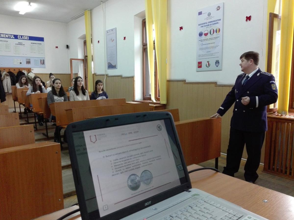 Specialistul în protejarea patrimoniului cultural naţional din cadrul Serviciului de Investigaţii Criminale al IPJ Brăila a prezentat elevilor noţiuni şi exemple privind patrimoniul cultural, în cadrul unui material PowerPoint. Cu această ocazie, elevii au fost invitaţi la o călătorie în trecut, în amintirile bunicilor, în momente de formare a trecutului nostru. “Discuţiile specialistului poliţiei cu elevii au avut drept rol conturarea unei imagini despre cultura şi istoria poporului român, precum şi identificarea elementelor care contribuie la formarea acestui ansamblu. Elevilor li s-a explicat ce reprezintă identitatea unei persoane, respectiv a unui popor şi prin ce se evidenţiază această identitate. Poliţiştii au explicat elevilor ce înseamnă patrimoniu cultural naţional şi care sunt elementele de patrimoniu pe care le pot admira şi proteja în judeţul lor”, au precizat reprezentanţii IPJ.