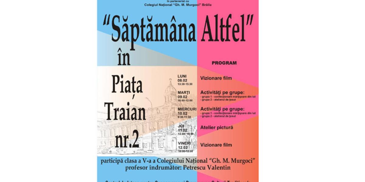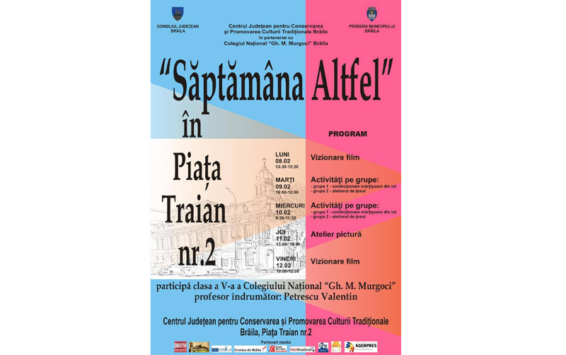 Consiliul Județean Brăila, cu sprijinul Primăriei Municipiului Brăila și Centrul Județean pentru Conservarea și Promovarea Culturii Tradiționale Brăila, în parteneriat cu Colegiul Național “Gheorghe Munteanu Murgoci”, organizează în această perioadă, până pe data de 12 februarie, o serie de activități educative cu titlul “Săptămâna altfel în Piața Traian nr. 2”, având ca scop ieșirea elevilor de clasa a V-a din rutina de învățare clasică, prin experimentarea unor activități altfel decât cele parcurse zi de zi la clasă.