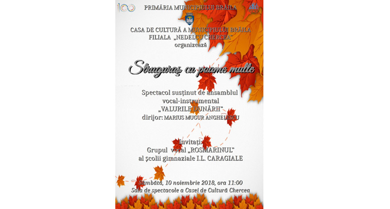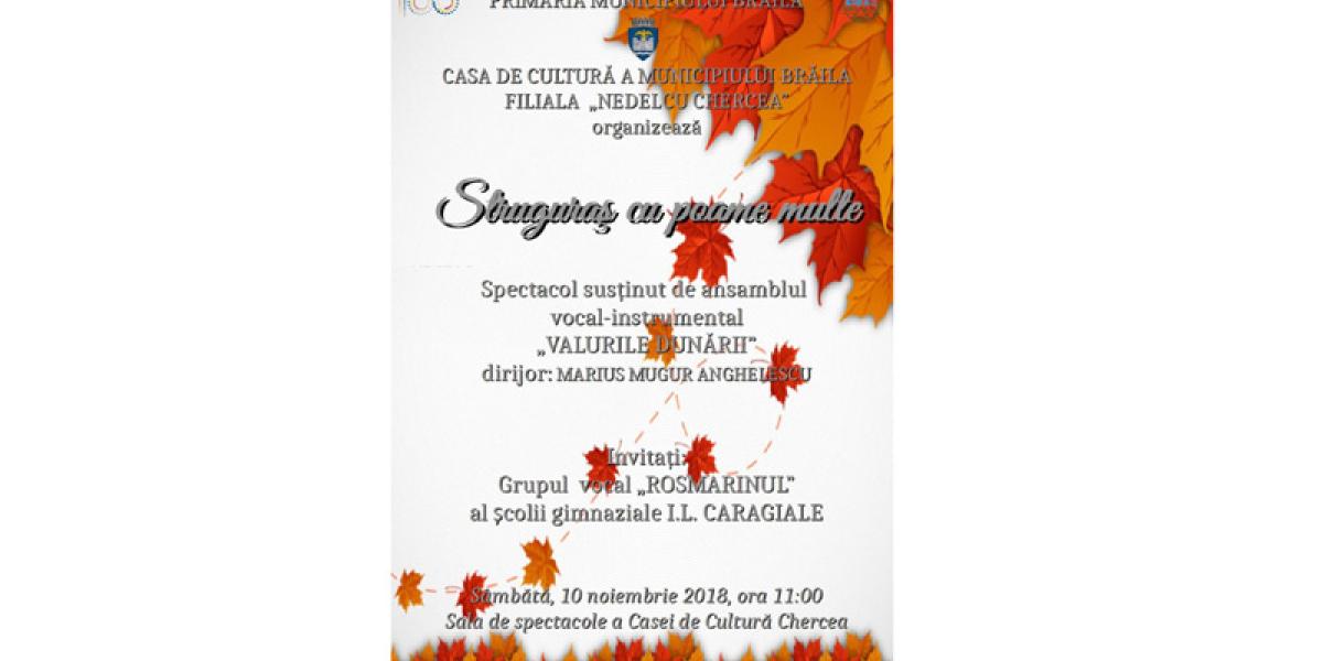 Sâmbătă, 10 noiembrie 2018, în Sala Mare a Casei de Cultură “Nedelcu Chercea”, Ansamblul vocal-instrumental “Valurile Dunării”, dirijat de Marius Mugur Anghelescu, precum şi invitaţii săi – solistul KARYM şi Grupul “Rosmarinul” al Şcolii “Ion Luca Caragiale” - vor oferi publicului din cartier spectacolul intitulat “Struguraş cu poame multe”. Spectacolul va include cântece şi poezii legate de începutul anului şcolar, dar şi piese din comoara folcorului românesc, cu cântece de bucurie, de rod al toamnei şi de joc. Grupul de mandoline va susţine piese orchestrale şi solistice, iar ansamblul va interpeta o serie de prelucrări folclorice.
