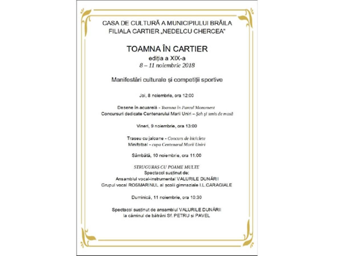 În perioada 8-11 noiembrie, la filiala din cartierul “Nedelcu Chercea” a Casei de Cultură a Municipiului Brăila, are loc cea de a XIX a ediţie a manifestărilor culturale şi sportive reunite sub genericul “Toamna în cartier”.