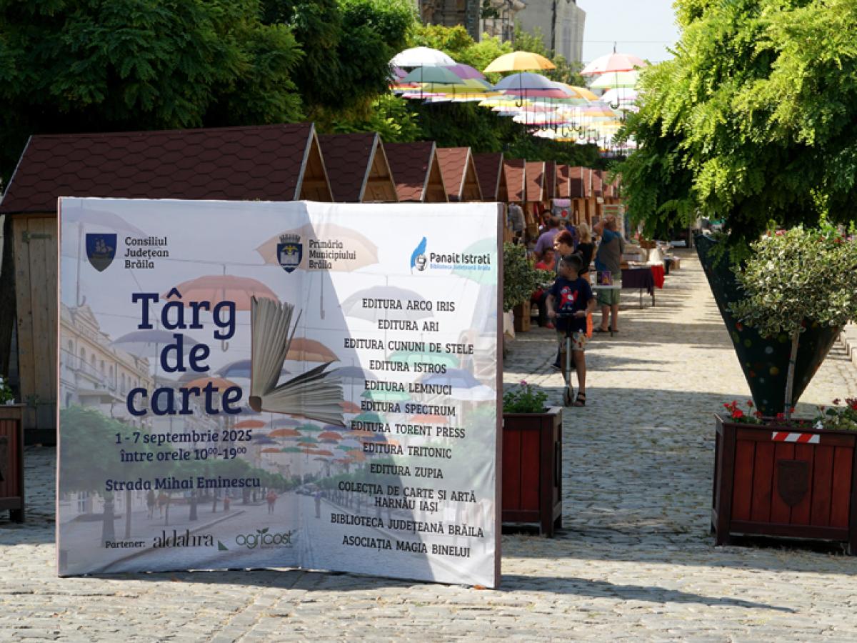 La început de toamnă, strada Mihai Eminescu din Brăila, cunoscută de localnici drept ”Regala”, s-a transformat într-o alee a culturii. Între 1 și 7 septembrie, brăilenii și vizitatorii din împrejurimi sunt invitați să descopere oferta celei de-a IX-a ediții a Târgului de Carte, organizat de Primăria Municipiului Brăila, Consiliul Județean Brăila și Biblioteca Județeană ”Panait Istrati”. Standurile, deschise zilnic între orele 10.00 și 19.00, își așteaptă cititorii cu titluri pentru toate gusturile și buzunarele – de la povești ilustrate pentru copii până la romane polițiste, fantasy, cărți de istorie, eseuri sau lucrări de spiritualitate.