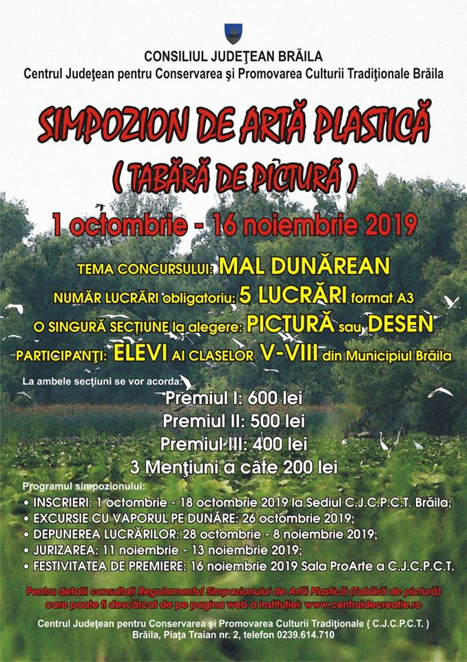 Sâmbătă, 16 noiembrie 2019, de la ora 9.00, în Sala ProArte a Centrului Judeţean pentru Conservarea şi Promovarea Culturii Tradiţionale Brăila, din Piaţa Traian, nr.2 va avea loc vernisajul expoziţiei Simpozionului de Artă Plastică -Tabăra de pictură. După cum v-am informat, tema simpozionului este "Mal dunărean", iar organizatorii taberei de pictură sunt Consiliul Judeţean Brăila, Centrul Judeţean pentru Conservarea şi Promovarea Culturii Tradiţionale Brăila.