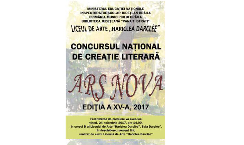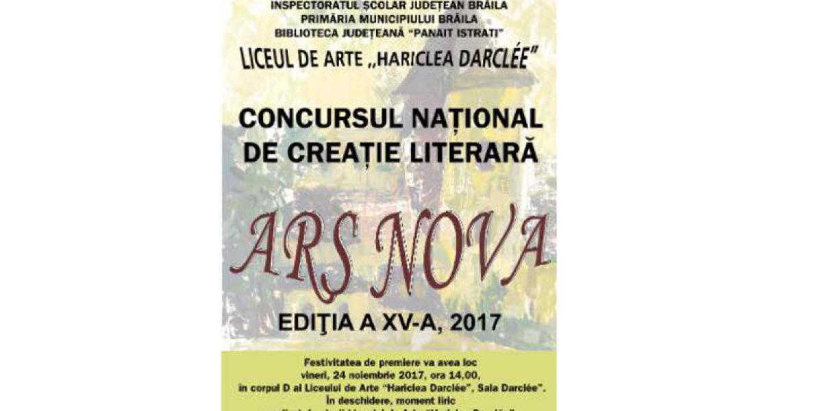 Cea de-a XV-a ediţie a Concursului Naţional de Creaţie Literară “Ars Nova” şi-a desemnat câştigătorii, festivitatea de premiere desfăşurându-se vineri, 24 noiembrie, la sala “Darclee” din corpul D al Liceului de Arte “Hariclea Darclee” Brăila.