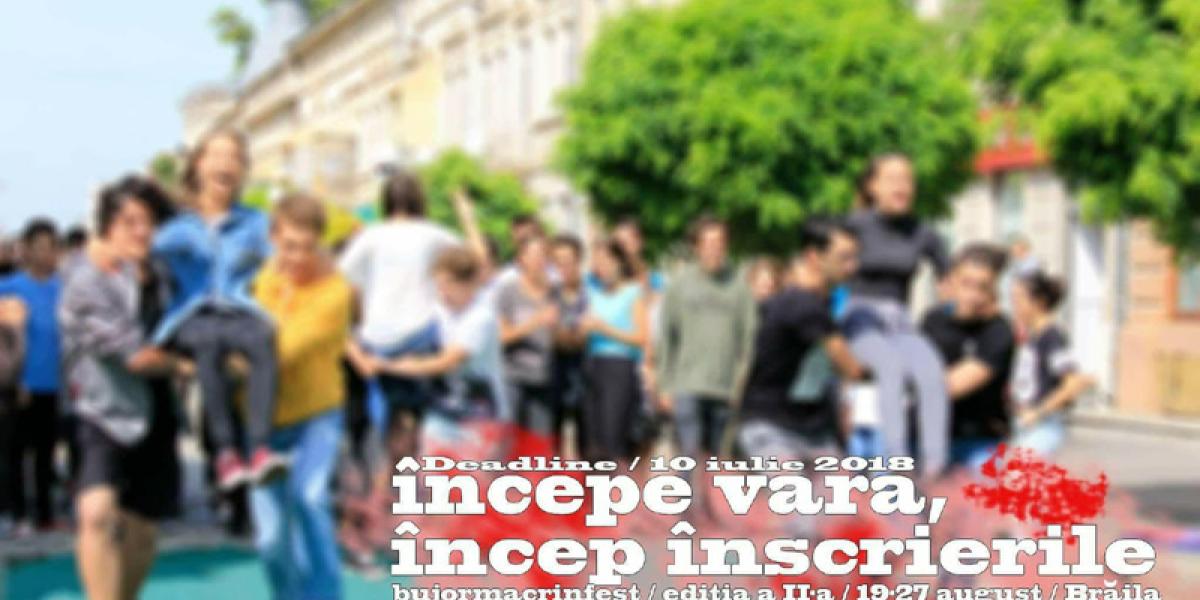 • Festivalului Naţional de Teatru pentru Tineri “Bujor Macrin” revine cu o nouă ediţie • în perioada 19-27 august, liceenii pasionaţi de actorie, regie, film, coregrafie şi fotografie sunt aşteptaţi la Brăila, înscrierile având loc până pe data de 12 iulie • “Bujor Macrin Fest înseamnă să lucreazi cu marii actori români, să înveţi de la traineri ce sunt gata să te îndrume într-o lume a artei, să acumulezi cunoştinţe într-un mod interactiv şi să te distrezi alături de tineri entuziasmaţi”, susţin organizatorii
