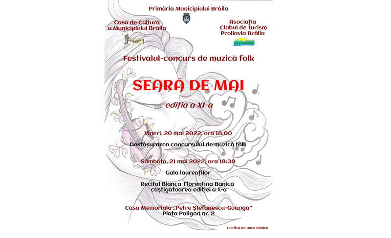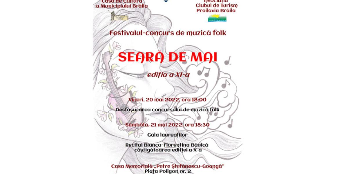 Potrivit comunicatului trimis de managerul Casei de Cultură a Municipiului Brăila, Emanoil Ciucașu, timp de două zile - vineri, 20 mai 2022, și sâmbătă, 21 mai 2022 - la Casa Memorială "Petre Ștefănescu-Goangă", din Piața Poligon nr. 2, se va desfășura Festivalul Concurs de Muzică Folk "Seară de Mai" - Ediția a XI-a. Manifestarea este organizată de Casa de Cultură a Municipiului Brăila, în parteneriat cu Asociația Clubul de Turism "Proilavia" și reunește tineri din Brăila "care doresc să-și afirme potențialul artistic în domeniul creației și interpretării muzicii folk".