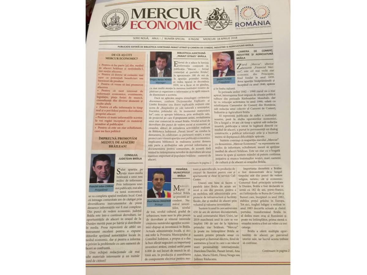 Miercuri, 18 aprilie, începând cu ora 15.00, la Regal Events&Ballroom (Clubul Progresul), cu prilejul Adunării Generale a Membrilor Camerei de Comerţ, Industrie şi Agricultură Brăila, a avut loc lansarea primului număr al ziarului “Mercur Economic”. Publicaţia este editată de Biblioteca Judeţeană “Panait Istrati” Brăila, Asociaţia Naţională a Bibliotecarilor şi Bibliotecilor Publice din România Filiala Brăila, în colaborare cu Camera de Comerţ, Industrie şi Agricultură Brăila şi se adresează mediului de afaceri brăilean. La eveniment au participat Viorel Marian Dragomir, primarul Municipiului Brăila şi Francisk Iulian Chiriac, preşedintele Consiliului Judeţean Brăila, care au salutat apariţia noii publicaţii cu temă economică.