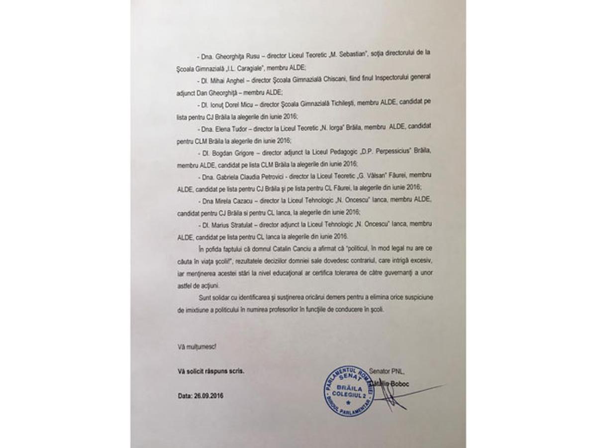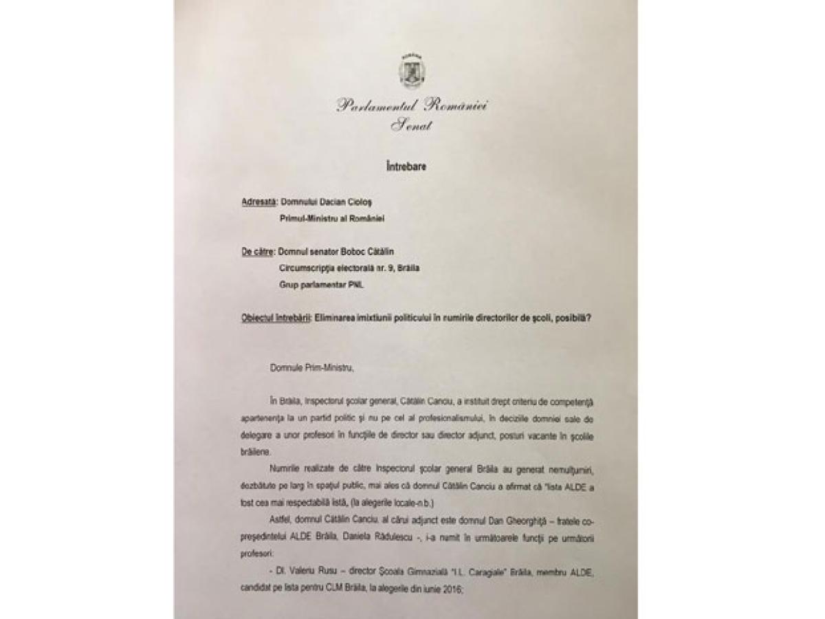 Senatorul PNL Cătălin Boboc este ferm convins că schimbările de directori efectuate de conducerea Inspectoratului Şcolar Judeţean (IŞJ) Brăila au la bază criterii politice. Parlamentarul a postat, ieri, un comentariu pe pagina personală de Facebook, însoţit de un document scanat, ce i-a fost înaintat premierului Dacian Cioloş. Boboc îl întreabă pe prim-ministrul României în legătură cu deciziile IŞJ Brăila, fiind de părere că numirile s-au făcut ţinându-se cont de apartenenţa directorilor la ALDE.