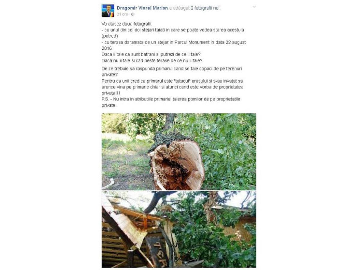 Nemulţumirile brăilenilor legate de tăierea stejarilor bătrâni din Parcul Monument au luat, ieri, amploare, în ciuda explicaţiilor primarului Marian Dragomir că la mijloc este vorba despre un teren privat. Supărările au apărut în mediul online, iar încet - încet, paginile de Facebook s-au transformat într-un adevărat “teren minat” al comentariilor pe această temă. Mai exact, după declaraţia sa pentru cotidianul “Obiectiv - Vocea Brăilei” legată de faptul că arborii tăiaţi erau bătrâni, bolnavi şi prezentau un real pericol, edilul-şef a venit şi cu o postare pe pagina sa personală de Facebook, însoţită de imagini cu starea degradată a stejarilor şi cu terasa distrusă de o creangă a acestora, care s-a rupt în urmă cu câteva săptămâni. “Vă ataşez două fotografii: cu unul din cei doi stejari tăiaţi în care se poate vedea starea acestuia (putred) şi cu terasa dărâmată de un stejar în Parcul Monument în data 22 august 2016. Dacă îi taie că sunt bătrâni şi putrezi, de ce îi taie? Dacă nu îi taie şi cad peste terase, de ce nu îi taie? De ce trebuie să răspundă primarul când se taie copaci de pe terenuri private? Pentru că unii cred că primarul este «tătucul» oraşului şi s-au învăţat să arunce vina pe primărie chiar şi atunci când este vorba de proprietatea privată!!! P.S. - Nu intră în atribuţiile primăriei tăierea pomilor de pe proprietăţile private”, a comentat Dragomir, stârnind nemulţumiri şi aprecieri deopotrivă din partea brăilenilor care i-au vizitat pagina. Interesant de precizat este că printre nemulţumiţi se numără şi preşedintele PNŢCD Brăila, Gheorghe Chiru, care a fost printre primii ce au semnalat tăierea stejarilor, tot în mediul virtual. Acesta a postat la rândul său un comentariu referindu-se la faptul că deşi primarul a amintit că proprietarul terenului unde au fost tăiaţi stejarii este SC “Istru” SA, a “uitat” să menţioneze cine deţine această societate. Mai exact fostul şef CJ Brăila, Gheorghe Bunea Stancu.