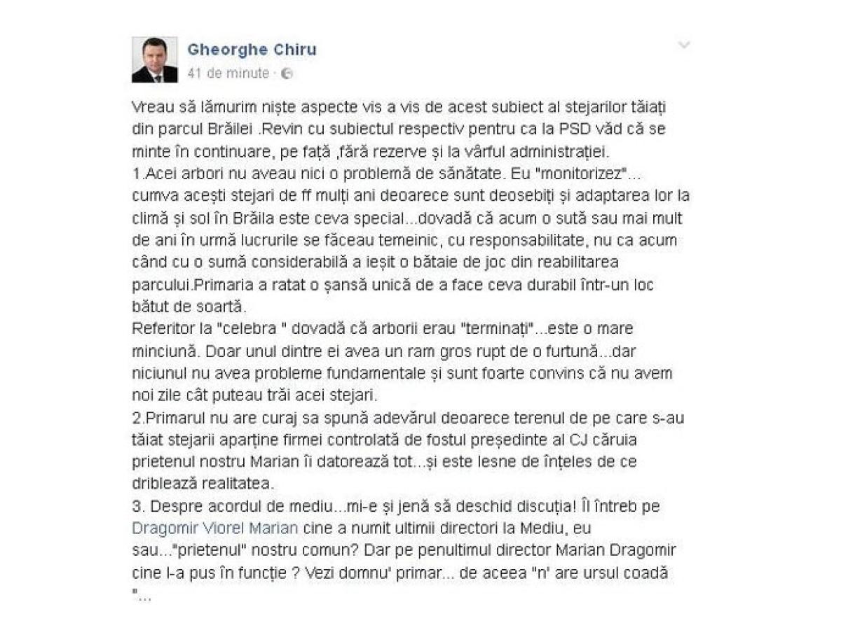 Situaţia l-a iritat la culme pe Chiru, care nu s-a arătat deloc impresionat de declaraţia primarului Marian Dragomir. Acesta a plecat de la ideea că, deşi discutăm de o proprietate privată, nu se poate trece cu vederea că SC “Istru” SA este firma fostului şef al CJ Brăila, Gheorghe Bunea Stancu, prin urmare lucrurile nu sunt tocmai simple. “La PSD văd că se minte în continuare, pe faţă, fără rezerve şi la vârful administraţiei. Acei arbori nu aveau nicio problemă de sănătate. Eu «monitorizez»... cumva aceşti stejari de foarte mulţi ani deoarece sunt deosebiţi şi adaptarea lor la climă şi sol în Brăila este ceva special... dovadă că acum o sută sau mai mult de ani în urmă lucrurile se făceau temeinic, cu responsabilitate, nu ca acum când cu o sumă considerabilă a ieşit o bătaie de joc din reabilitarea parcului. Primăria a ratat o şansă unică de a face ceva durabil într-un loc bătut de soartă. Referitor la «celebra» dovadă că arborii erau «terminaţi»... este o mare minciună. Doar unul dintre ei avea un ram gros rupt de o furtună... dar niciunul nu avea probleme fundamentale şi sunt foarte convins că nu avem noi zile cât puteau trăi acei stejari. Primarul nu are curaj să spună adevărul deoarece terenul de pe care s-au tăiat stejarii aparţine firmei controlate de fostul preşedinte al CJ căruia prietenul nostru Marian îi datorează tot... şi este lesne de înţeles de ce driblează realitatea. Despre acordul de mediu... mi-e şi jenă să deschid discuţia! Îl întreb pe Dragomir Viorel Marian cine a numit ultimii directori la Mediu, eu sau... «prietenul» nostru comun? Dar pe penultimul director Marian Dragomir cine l-a pus în funcţie? Vezi domnu' primar... de aceea «n'are ursul coadă»...”, a scris Chiru.