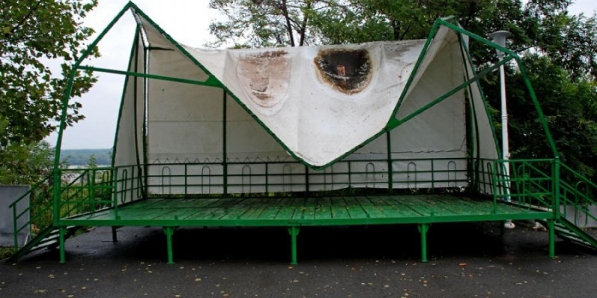 Copertina scenei de spectacole din Grădina Mare a fost distrusă efectiv de vremea rea de la începutul săptămânii. Apa acumulată pe prelată şi rafelele de vânt au îndoit cadrul metalic într-o manieră ce îl face inutilizabil. Din fericire, nimeni nu se afla prin zonă în momentul producerii incidentului, astfel că acesta nu s-a soldat cu victime omeneşti.