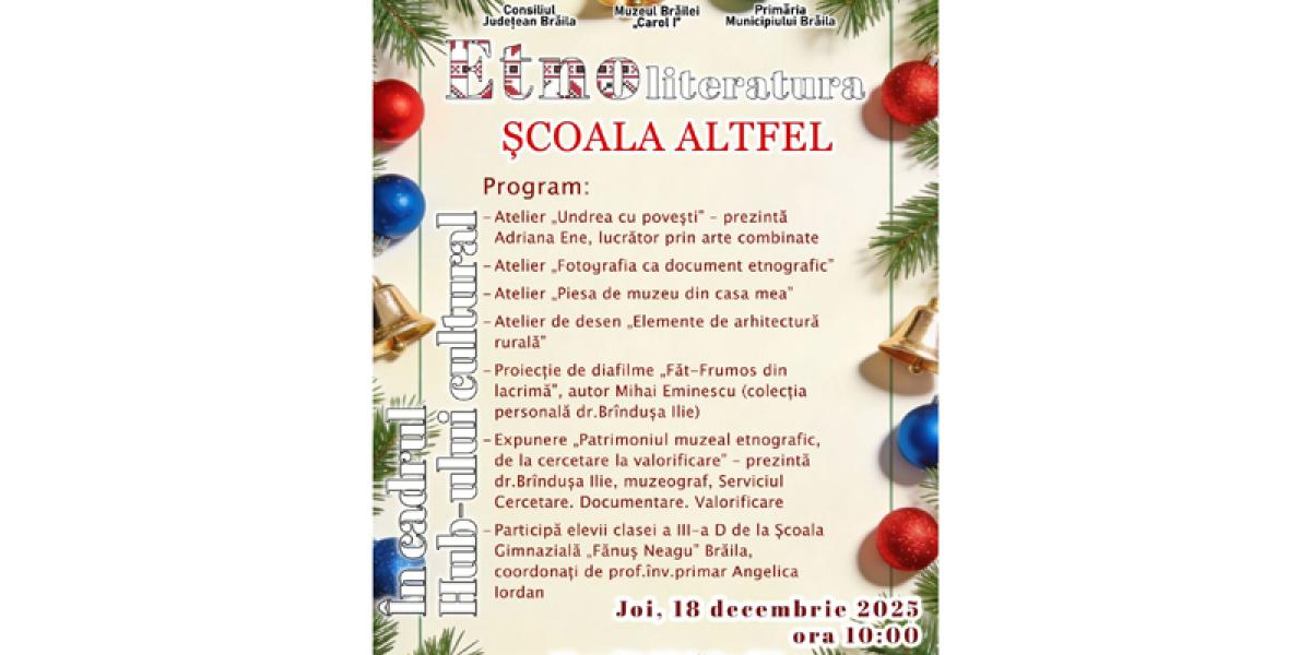 În cadrul programului „Școala altfel”, Muzeul Brăilei „Carol I” - Casa Colecțiilor Etnografice organizează joi, 18 decembrie, începând cu ora 10:00, o nouă întâlnire în cadrul Hub-ului cultural „Etnoliteratura”. Evenimentul va avea loc la Casa Alexiu (Colecțiile Etnografice), de pe Strada Polonă nr. 14, cu participarea elevilor clasei a III-a D de la Școala Gimnazială „Fănuș Neagu” Brăila, coordonați de prof. înv. primar Angelica Iordan.