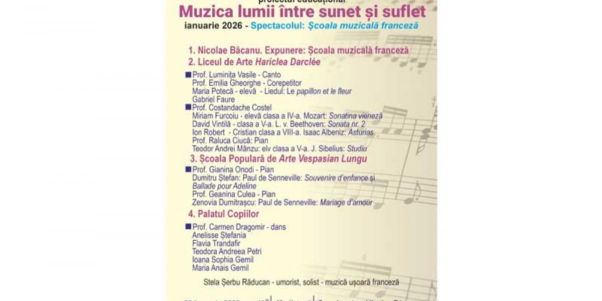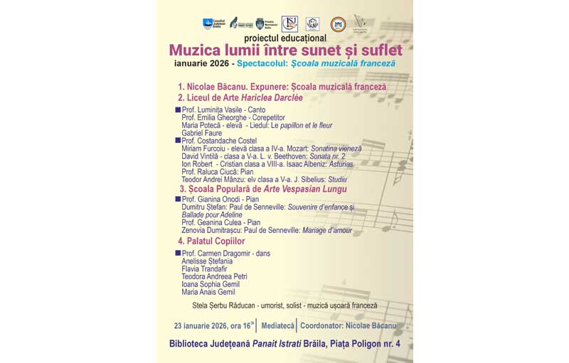 Iubitorii de muzică de calitate, cadrele didactice și elevii brăileni sunt invitați vineri, 23 ianuarie 2026, de la ora 16:30, la Biblioteca Județeană „Panait Istrati” Brăila - Mediatecă, pentru a participa la spectacolul „Școala muzicală franceză”.