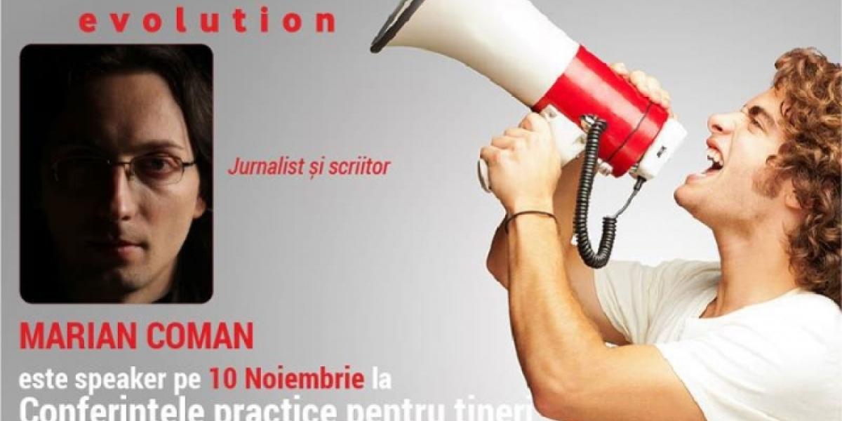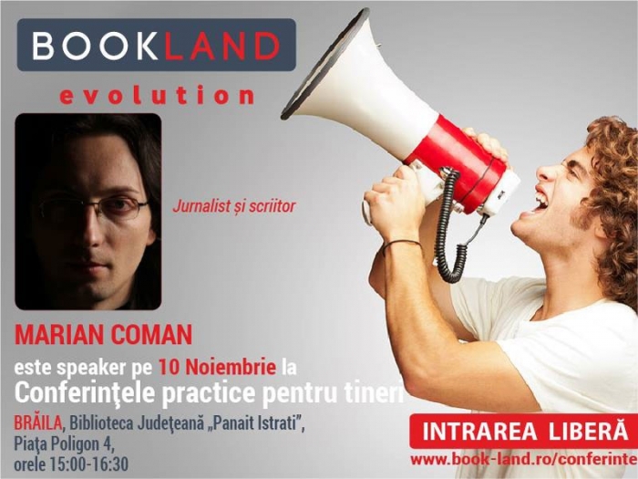 Scriitorul Marian Coman le va vorbi, astăzi, începând cu ora 15.00, tinerilor brăileni participanţi la Conferinţele practice organizate de BookLand, la Bibilioteca Judeţeană "Panait Istrati", din Piaţa Poligon, nr. 4. Evenimentul face parte dintr-un proiect maraton ce îşi propune să aducă în faţa elevilor şi studenţilor din douăsprezece oraşe ale României o serie de profesionişti din diverse domenii de activitate.