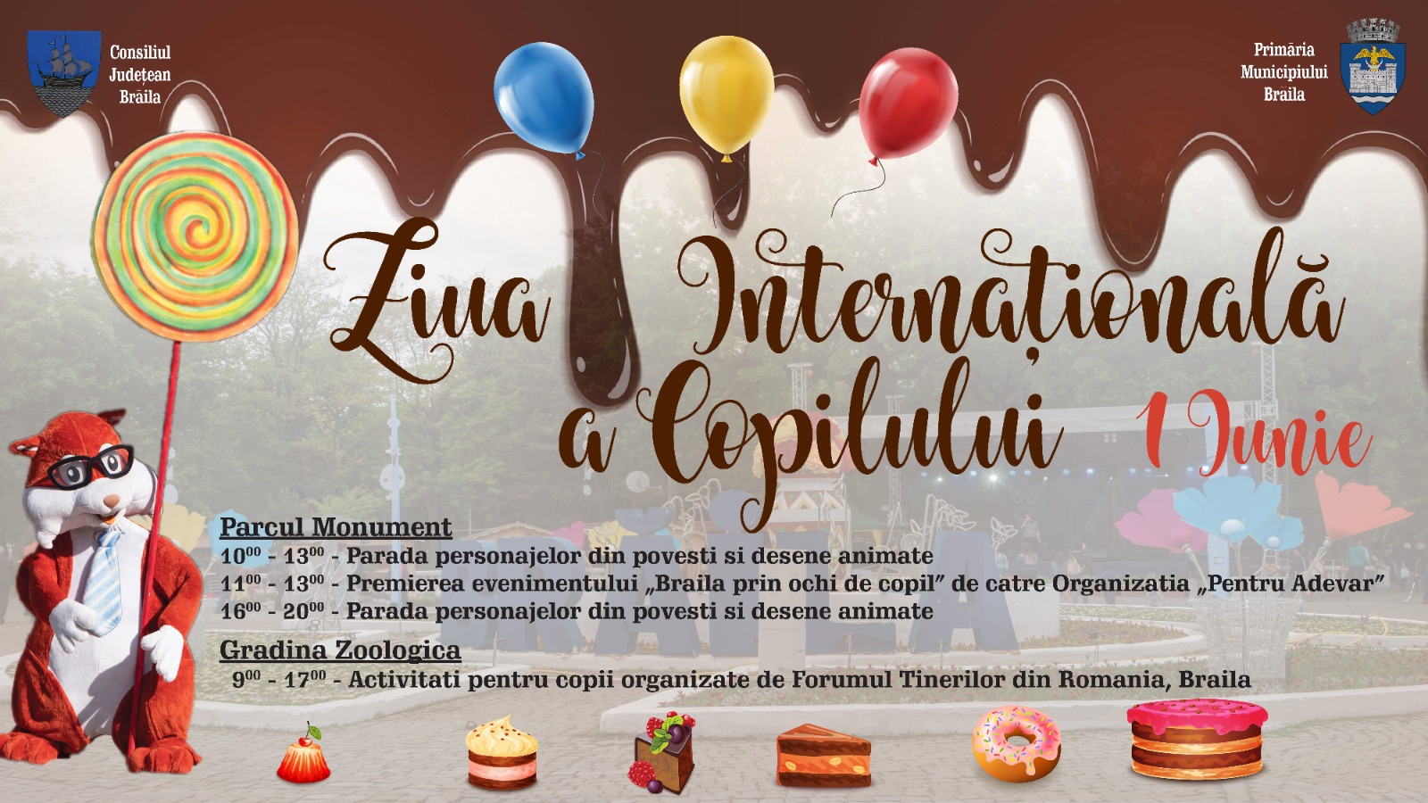 * activități precum karaoke, dans, desene pe asfalt, jocuri, sunt doar câteva dintre suprizele ce îi așteaptă pe copii la Zoo Brăila, intrarea fiind gratuită pentru aceștia * în Parcul Monument, cei mici se vor putea întâlni cu persoanejele îndrăgite din povești * tot în Parcul Monument, în perioada 28 mai-1 iunie, se desfășoară o expoziție de dulciuri cu vânzare