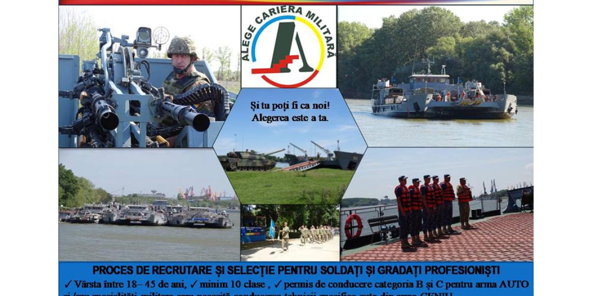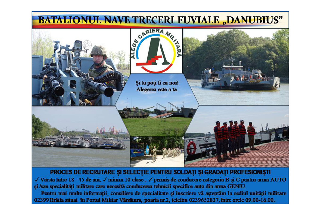 Începând cu data de 12 februarie 2024, brăilenii cu vârste între 18 și 45 de ani, care vor să facă parte din structurile Armei Geniu, sunt așteptați să se înscrie la selecția organizată pentru posturile de soldat gradat profesionist în cadrul Batalionului 72 Geniu „General Constantin Savu”, cu sediul pe Calea Călărașilor nr. 311, Brăila (structură a Brigăzii 10 Geniu „Dunărea de Jos”). De asemenea, cei interesați sunt invitați la selecția organizată pentru posturile de soldat gradat profesionist în cadrul Batalionului Nave Treceri Fluviale „Danubius”, cu sediul în Portul Militar Vărsătura, jud. Brăila, poarta nr. 2. Pentru ambele structuri ale Brigăzii 10 Geniu „Dunărea de Jos” sunt necesare următoarele criterii de recrutare: