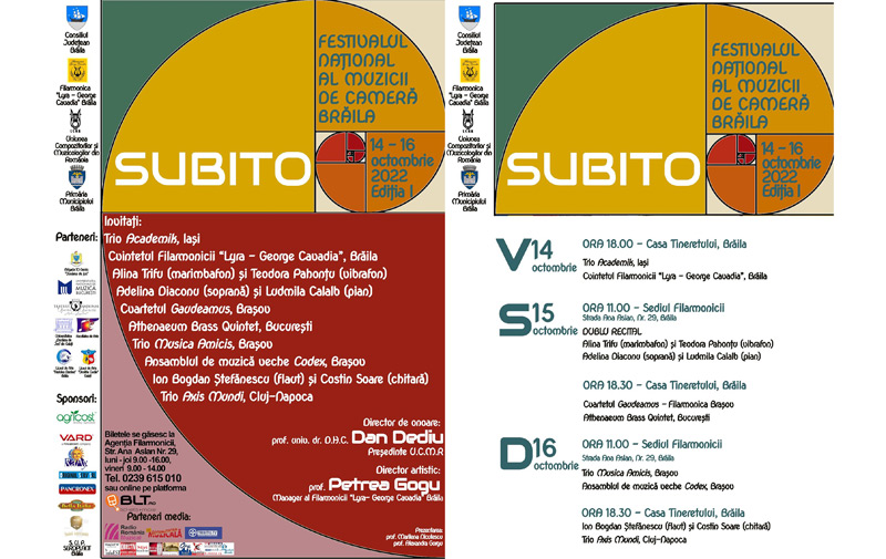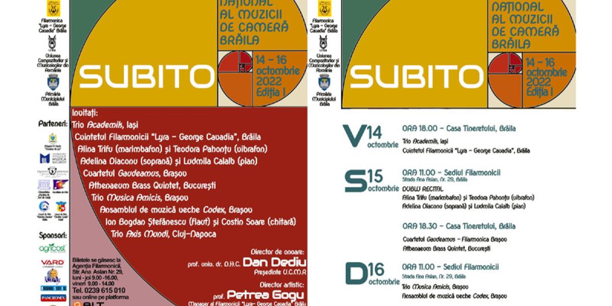 „Ce transformă un festival într-o reușită încă de la prima ediție? În primul rând pasiunea și grija pentru detalii a organizatorilor, care, din preaplinul dragostei pentru muzică încearcă să reverse totul asupra publicului. Apoi, invitații remarcabili ce se coagulează în cele zece formații camerale ce-și vor sincroniza treptat pulsațiile genurilor muzicale diverse cu ritmul inimilor dumneavoastră. La acestea, se adaugă repertoriile abordate ce însumează sute de pagini din marea Muzică. Toate acestea vă sunt dedicate dumneavoastră, publicului, fără de care actul artistic este incomplet și fără sens. Vă invităm, astfel, să întregiți parcursul compozitor - interpret - receptor în stilul SUBITO - Festivalul Național al Muzicii de Cameră, Brăila”, precizează, într-un comunicat, prof. Alexandra Gurgu, secretar muzical al Filarmonicii „Lyra - George Cavadia” Brăila.