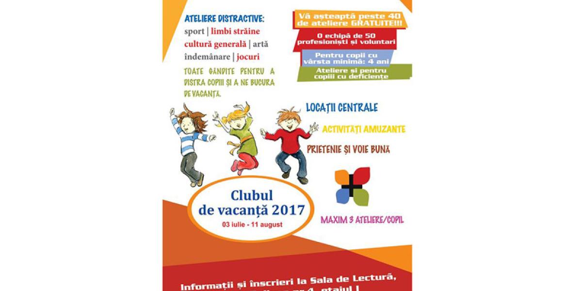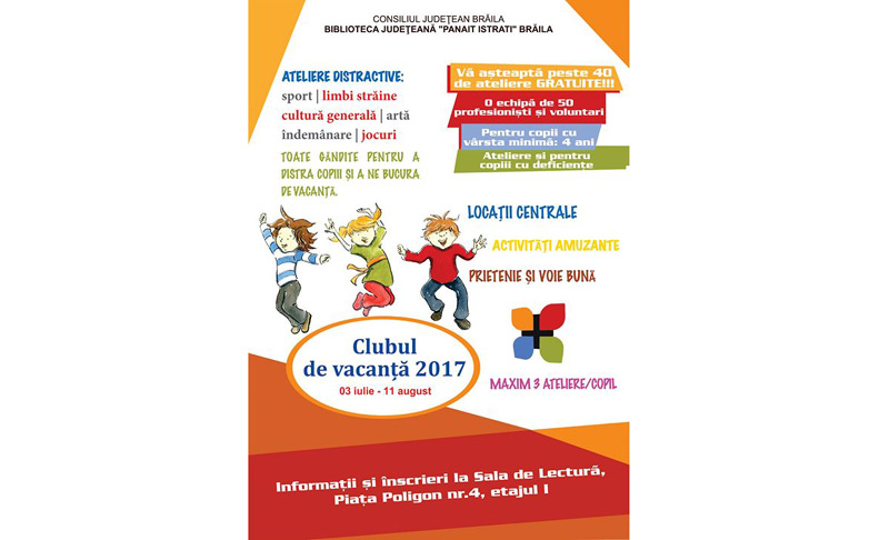• luni, 3 iulie 2017, începând cu ora 9.00, copiii şi adolescenţii sunt aşteptaţi la Biblioteca judeţeană “Panait Istrati”, unde pot participa la aproximativ 50 de ateliere creativ-educative
