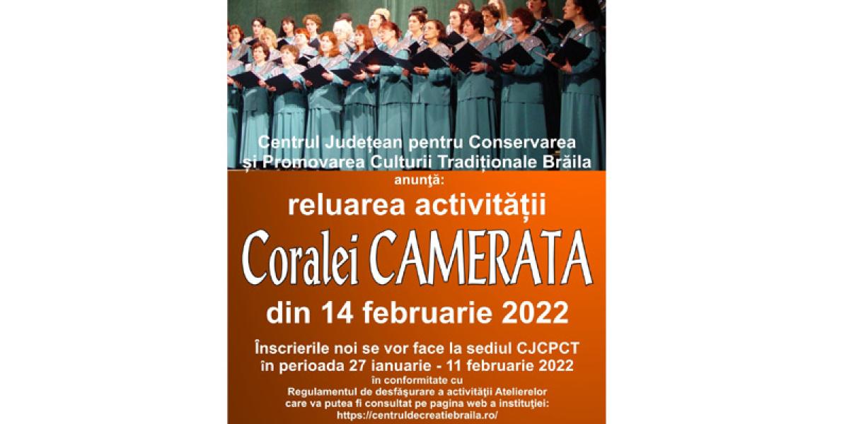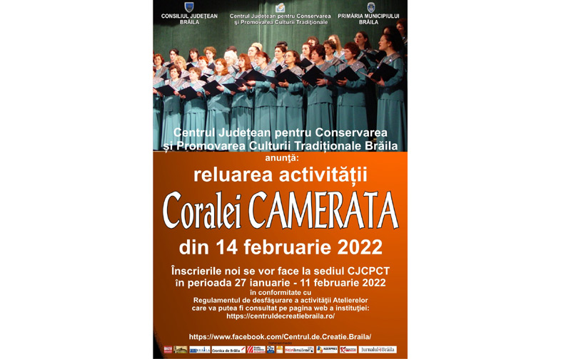 Corala Feminină „Camerata” își va relua activitatea artistică de la jumătatea acestei luni, informează Consiliul Județean Brăila, Primăria Municipiului și Centrul Județean pentru Conservarea și Promovarea Culturii Tradiționale Brăila (Centrul de Creație) Brăila. Totodată, Centrul de Creație Brăila anunță că se mai fac înscrieri pentru includerea în „Camerata” până la data de 11 februarie, iar pe 14 februarie aceasta își va relua, efectiv, activitatea. Înscrierile se fac la sediul Centrului Județean pentru Conservarea și Promovarea Culturii Tradiționale Brăila (CJCPCT) din Piața Traian nr. 2, iar Regulamentul de desfășurare a activității Atelierelor poate fi consultat pe pagina web a instituției (http://centruldecreatiebraila.ro). Informații suplimentare se pot obține la numărul de telefon 0239/614.710.
