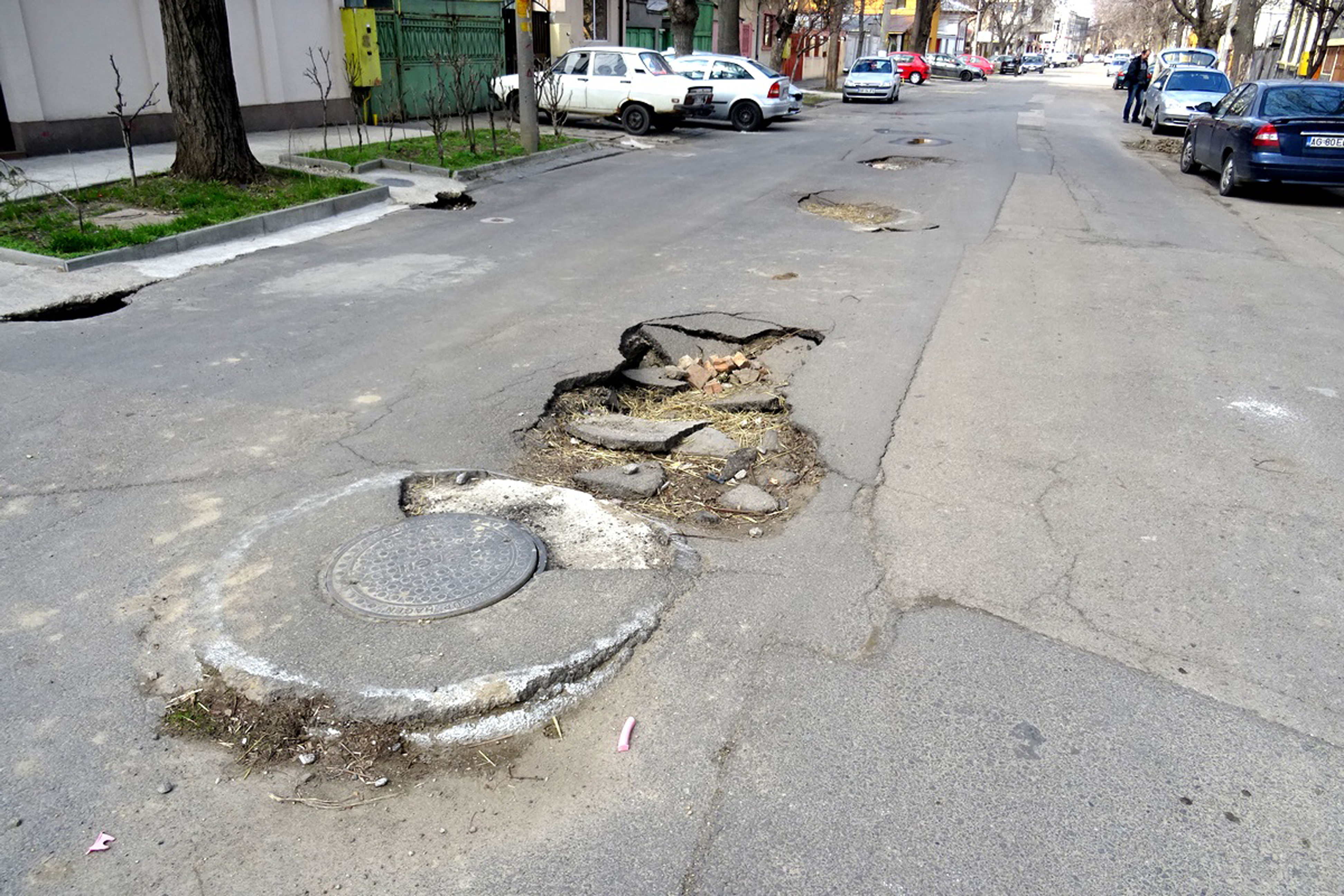 • pe Str. Rahovei, şoferii au de ocolit adevărate cratere, din cauza tasărilor apărute de-a lungul conductei de canalizare • locatarii străzii se plâng că problemele de acest gen nu mai încetează de câţiva ani, de când s-a lucrat pentru înlocuirea conductei de canalizare • rezolvarea situaţiei intră în sarcina CUP “Dunărea” • “Am moştenit aceste probleme şi trebuie să le rezolv cumva”, spune directorul Silviu Mangiurea