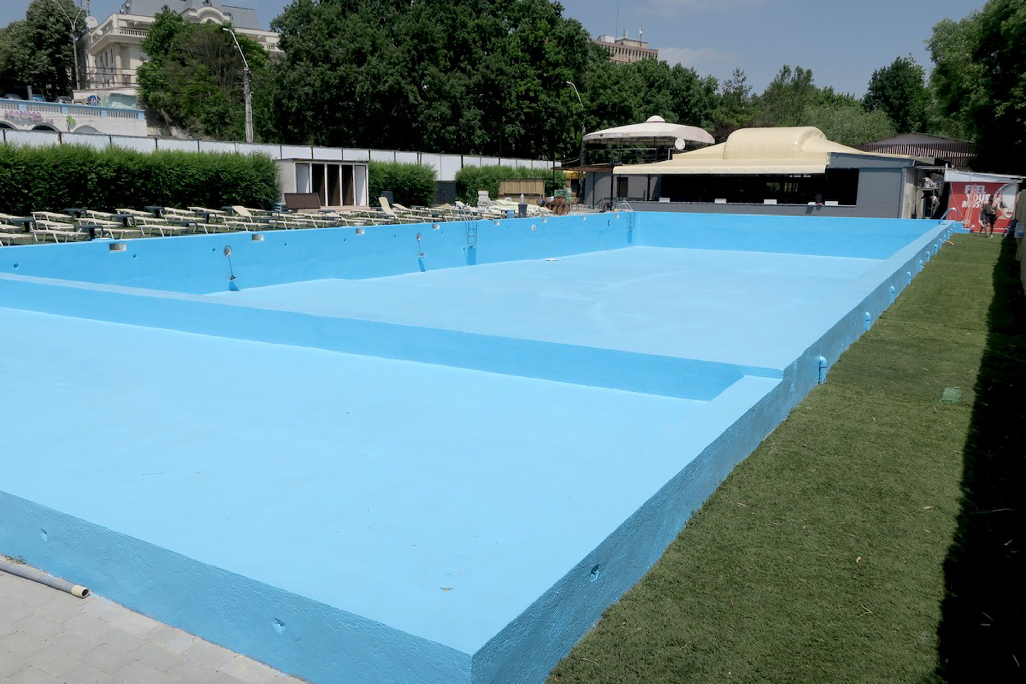 Ne aflăm în ultimele zile ale lunii mai, iar la ştrand pregătirile pentru redeschidere sunt aproape gata. Chiar dacă nu s-a respectat întru totul termenul primei etape, adică 30 aprilie, se vede clar că investitorul are intenţii serioase. Până la ora actuală a fost reabilitat bazinul, reparându-se porţiunile unde tencuiala începuse să se desprindă. De asemenea, s-au înlocuit filtrele, pompele de apă, sistemul de iluminat şi a fost vopsit tot interiorul. De astăzi, se poate da drumul la apă. Bazinul are o capacitate de 830 metri cubi, cu adâncime cuprinsă între 1,3 şi 1,8 m, dar şi cu un spaţiu special pentru copii, cu adâncime de 40 cm. Apa este recirculată, investitorul dând asigurări că este permanent filtrată şi tratată, astfel încât să nu existe niciun risc pentru cei care folosesc bazinul.