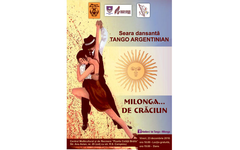 Vineri, 23 decembrie, începând cu ora 18.00, la Centrul Multicultural şi de Recreere „Poarta Cetăţii” Brăila, situat pe Str. Ana Aslan, nr. 29, are loc o Seară dansantă de Tango Argentinian. Manifestarea este organizată de Biblioteca Judeţeană „Panait Istrati” şi reprezintă evenimentul de final al primei serii de participanţi la Clubul de Tango Argentinian, desfăşurat la Bibliotecă pe parcursul anului 2016.