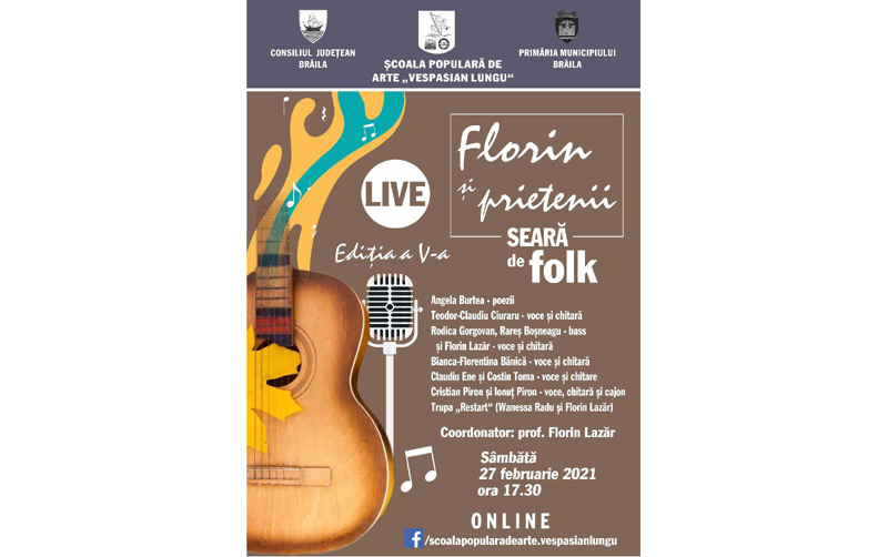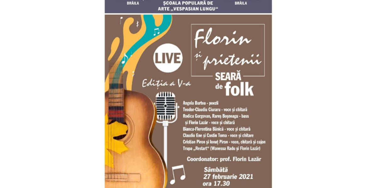 Școala Populară de Arte "Vespasian Lungu" Brăila, cu sprijinul Consiliului Județean Brăila și al Primăriei Municipiului Brăila, organizează cea de-a V-a ediție a Serii de folk „Florin și prietenii”.