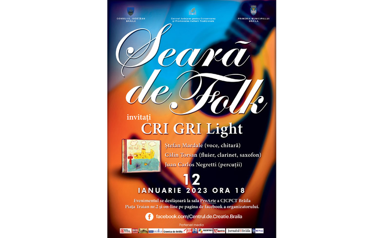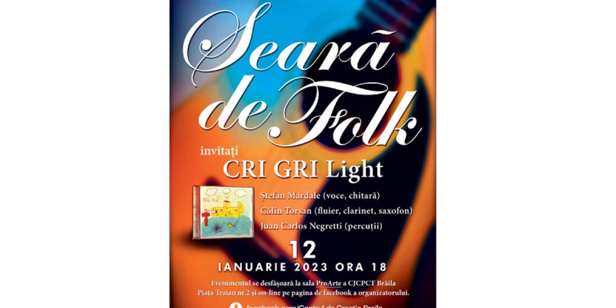 Invitați la Seara de folk de la Centrul Județean pentru Conservarea și Promovarea Culturii Tradiționale Brăila sunt: Cri Gri Light - Ștefan Mardale (voce, chitară), Călin Torsan (fluier, clarinet, saxofon), Juan Carlos Negretti (percuții).