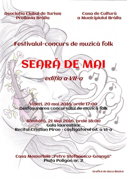 Vineri, 20 mai şi sâmbătă, 21 mai 2016, la Casa Memorială "Petre Ştefănescu-Goangă" se va desfăşura festivalul-concurs de muzică folk „Seară de Mai".