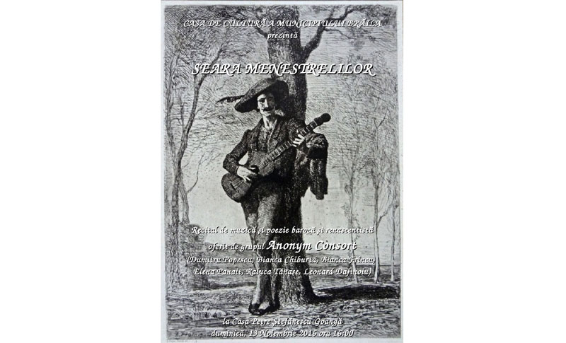 Duminică, 13 noiembrie 2016, de la ora 16:00, la Casa de Cultură a Municipiului Brăila are loc Seara Menestrelilor - un recital de muzică şi poezie barocă şi renascentistă oferit de grupul Anonym Consort.