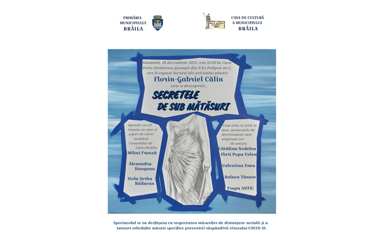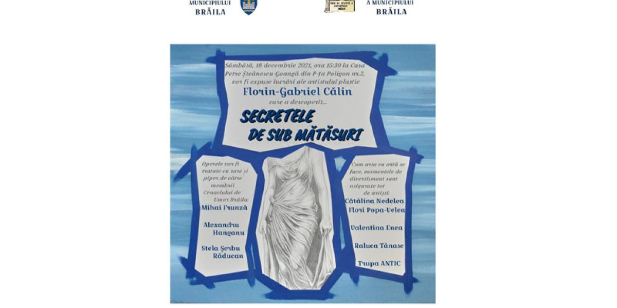 Casa de Cultură a Municipiului Brăila îi invită pe iubitorii de frumos sâmbătă, 18 decembrie 2021, începând cu ora 15.30, la Casa Memorială "Petre Ștefănescu-Goangă", pentru a afla "Secretele de sub mătăsuri". "Una dintre cele mai discutate și intrigante imagini în literatura și arta universală este cea a femeii. O pleiadă de poeți, scriitori, pictori din întreaga lume au iubit, au admirat, au urât femeia, dar niciunul nu a rămas indiferent față de ea. Este și cazul artistului plastic Florin-Gabriel Călin care, prin mijloace specifice, a descoperit o serie de taine pe care le puteți afla la vernisajul expoziției sale intitulată chiar așa: "Secretele de sub mătăsuri", precizează, într-un comunicat trimis redacției noastre, managerul Casei de Cultură, Emanoil Ciucașu.