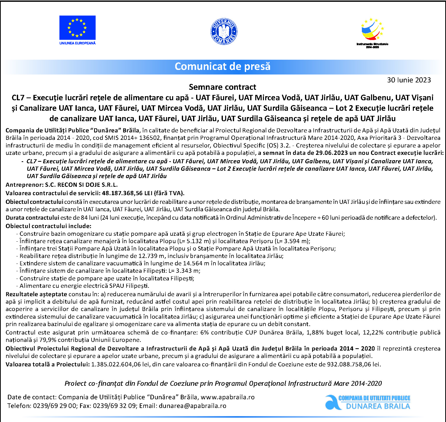 Semnare contract CL7 – Execuție lucrări rețele de alimentare cu apă - UAT Făurei, UAT Mircea Vodă, UAT Jirlău, UAT Galbenu, UAT Vișani și Canalizare UAT Ianca, UAT Făurei, UAT Mircea Vodă, UAT Jirlău, UAT Surdila Găiseanca – Lot 2 Execuție lucrări rețele
