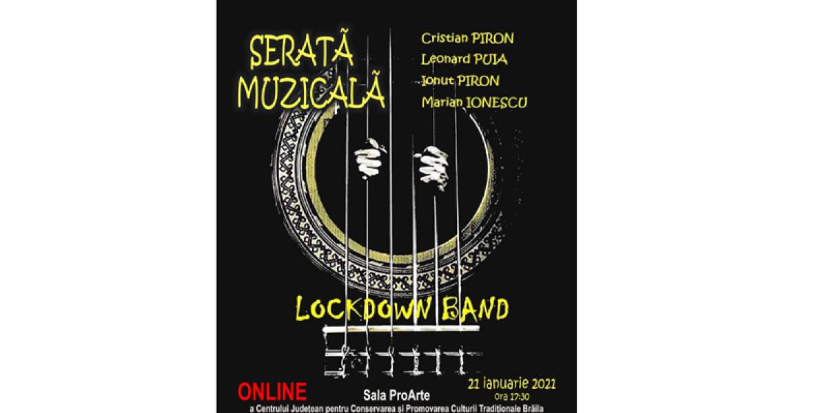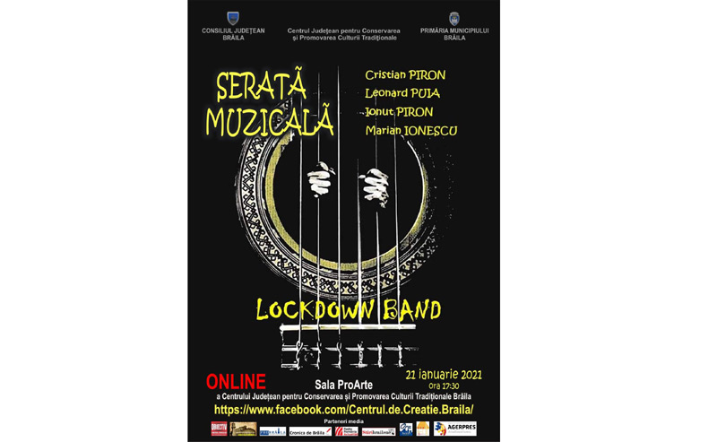 Astăzi, 21 ianuarie, de la ora 17.30, la Sala ProArte a Centrului Județean pentru Conservarea și Promovarea Culturii Tradiționale Brăila are loc o SERATĂ MUZICALĂ online. Evenimentul LOCK DOWN BAND este susținut de Cristian Piron, Leonard Puia, Ionuț Piron și Marian Ionescu și este organizat de Consiliul Județean Brăila, Centrul Județean pentru Conservarea și Promovarea Culturii Tradiționale și Pimăria Municipiului Brăila.