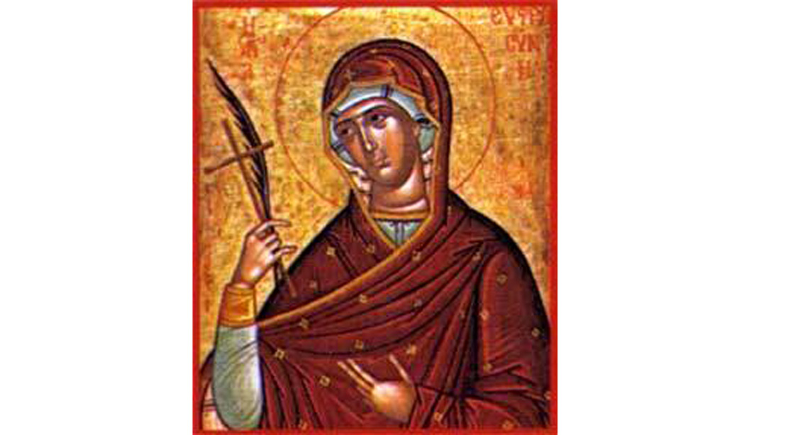 Sfanta Cuvioasa Eufrosina a trait in Alexandria in vremea imparatului Teodosie cel Mic (sec V). Ea a fost rodul staruintei in rugaciune catre Dumnezeu a parintilor ei, care i-a binecuvantat cu nasterea de prunci dupa o vreme indelungata. La varsta de 12 ani, Eufrosina a devenit orfana de mama ramanand sub ocrotirea tatalui sau, Pafnutie. Implinind varsta de 18 ani si nevrand sa se casatoreasca, Eufrosina a parasit in taina casa parinteasca si, imbracand haine barbatesti, a intrat intr-o manastire de monahi. Staretul a primit-o, punand-o sub ascultarea parintelui Agapit.