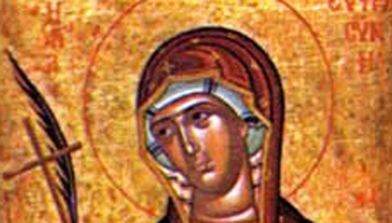 Sfânta Eufrosina a trăit în cetatea Alexandriei, pe vremea împăratului creştin Teodosie cel Mic (sec V d.H.). A fost rodul stăruinţei în rugăciune fierbinte către Dumnezeu a părinţilor ei, care au fost binecuvântaţi tocmai când îşi pierduseră orice nădejde. La vârsta de 12 ani, Eufrosina a devenit orfană de mamă, rămânând sub îngrijirea tatălui său, Pafnutie. Împlinind vârsta de 18 ani şi nevrând să se căsătorească, Eufrosina a părăsit în taină casa părintească şi, îmbrăcând haine bărbăteşti, a intrat într-o mănăstire de călugări. După ce a primit-o în mănăstire, stareţul a pus-o sub ascultarea părintelui Agapit. Până la sfârşitul vieţii sale - vreme de 38 de ani - Eufrosina avea să trăiască în acest aşezământ monahal, dobândind o viaţă duhovnicească sfântă, fără ca cineva să ştie că este femeie.